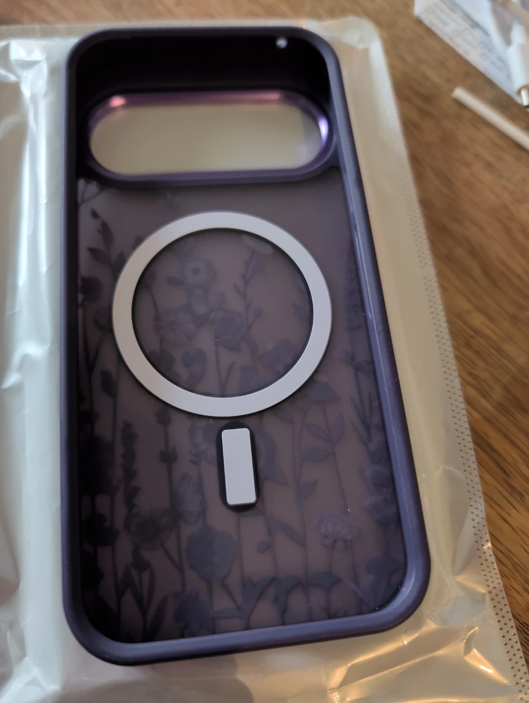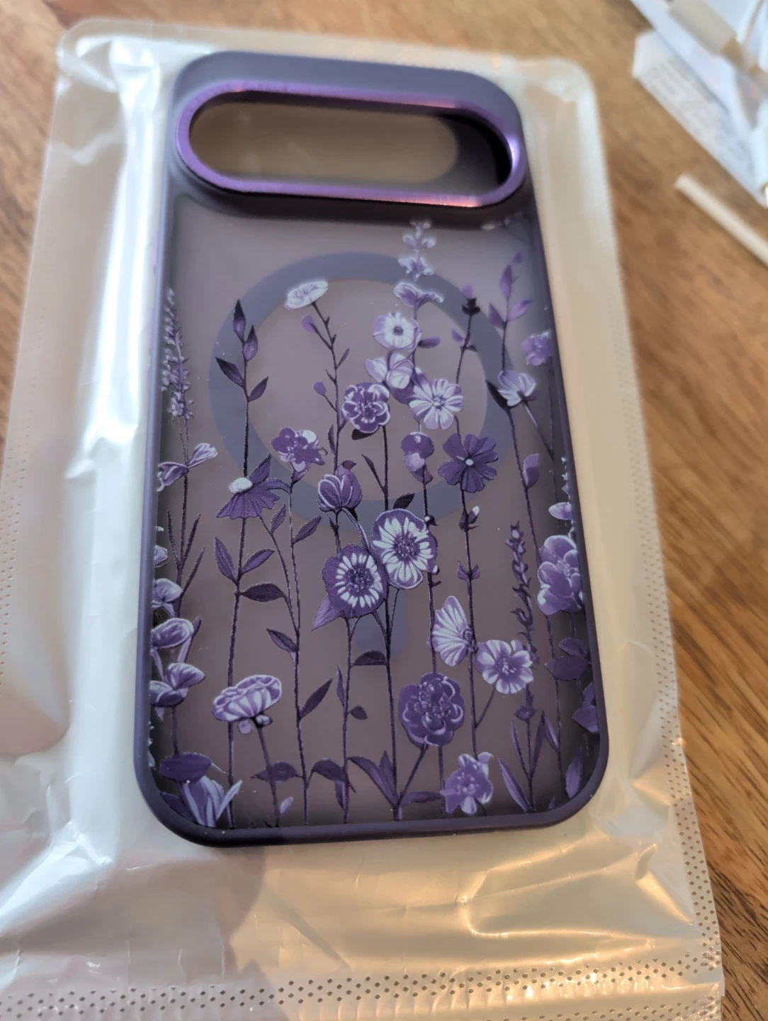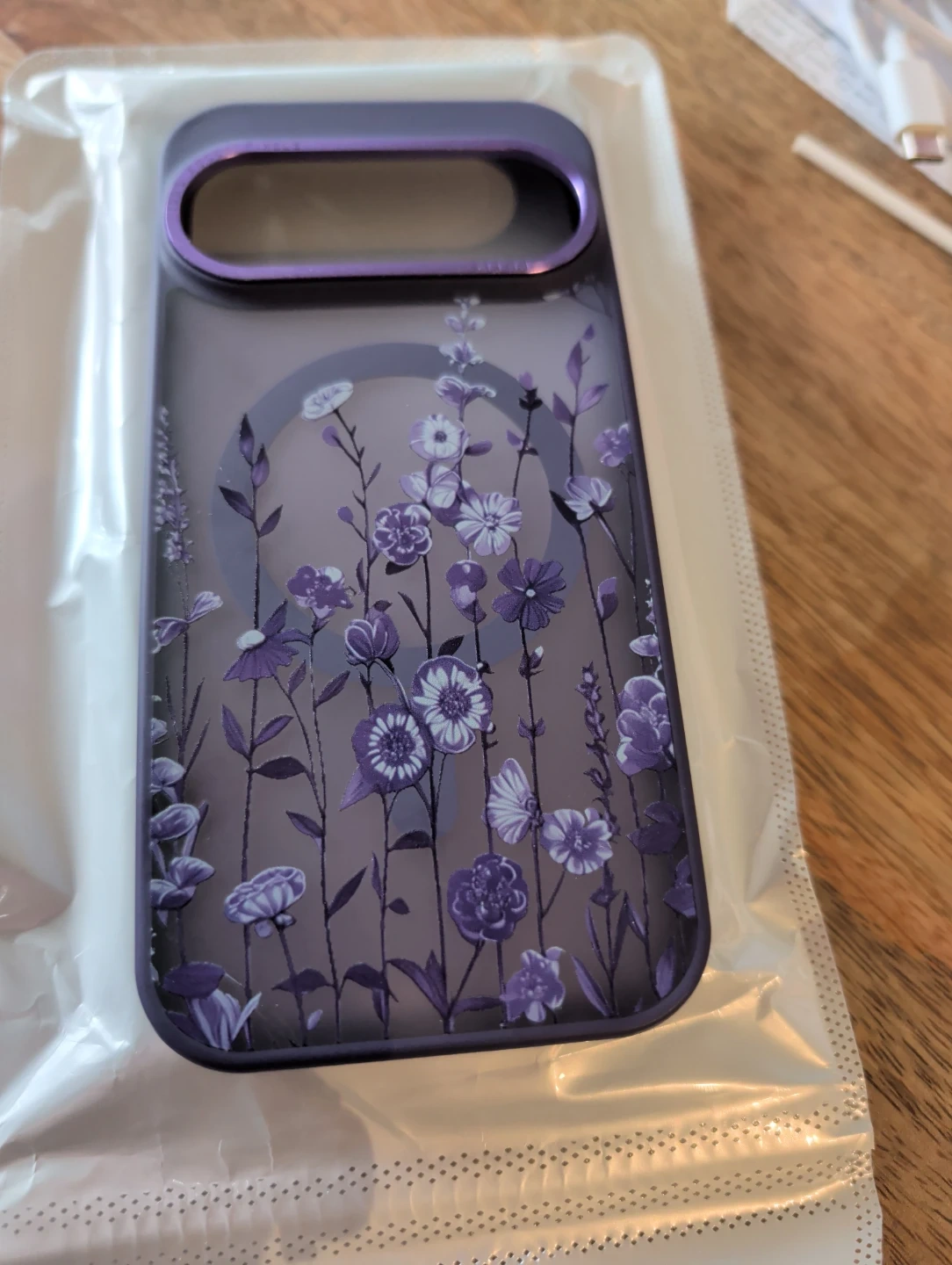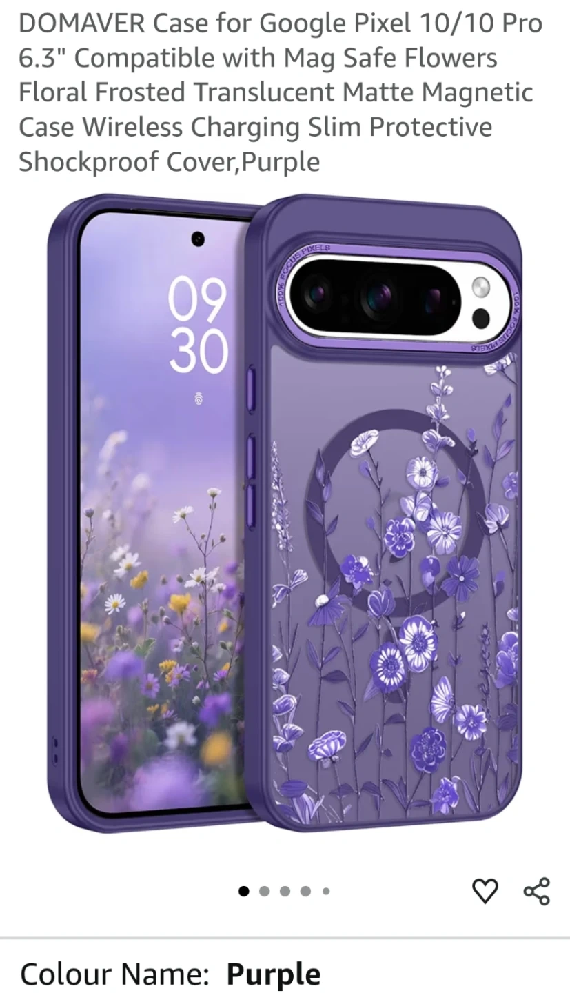 Purple floral case for Google Pixel 10/10 Pro (does not fit the XL version). Compatible with MagSafe wireless charging. Features a translucent purple floral design. Protective shockproof cover.
