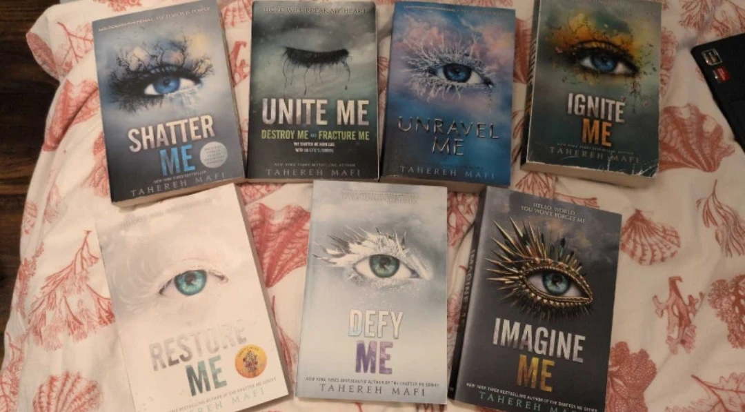 This is a collection of 7 books from the Shatter Me series, written by Tahereh Mafi. Titles include Shatter Me, Unite Me, Unravel Me, Ignite Me, Restore Me, Defy Me, and Imagine Me. These are paperback editions. Some are in excellent condition while two are a bit used.