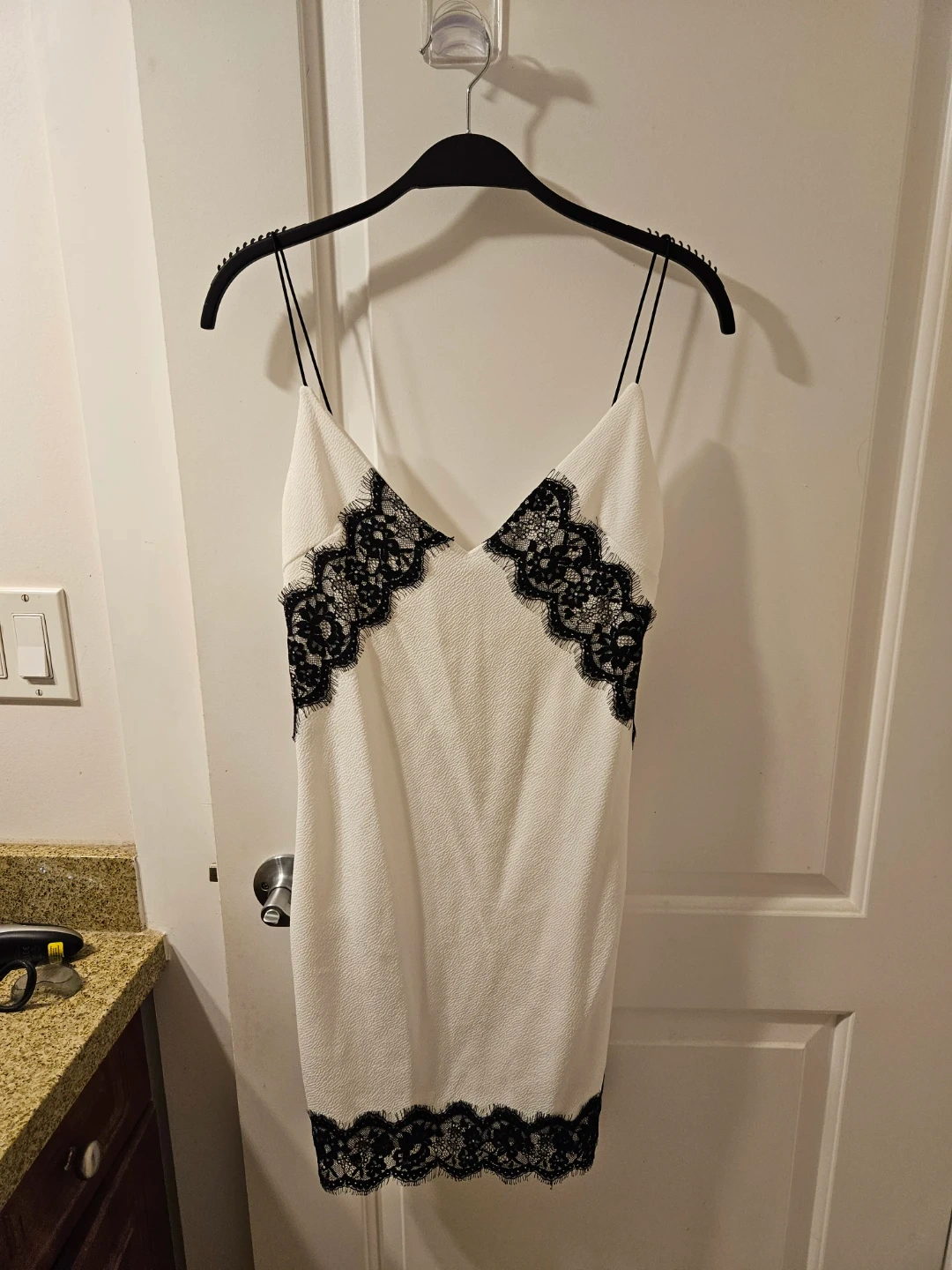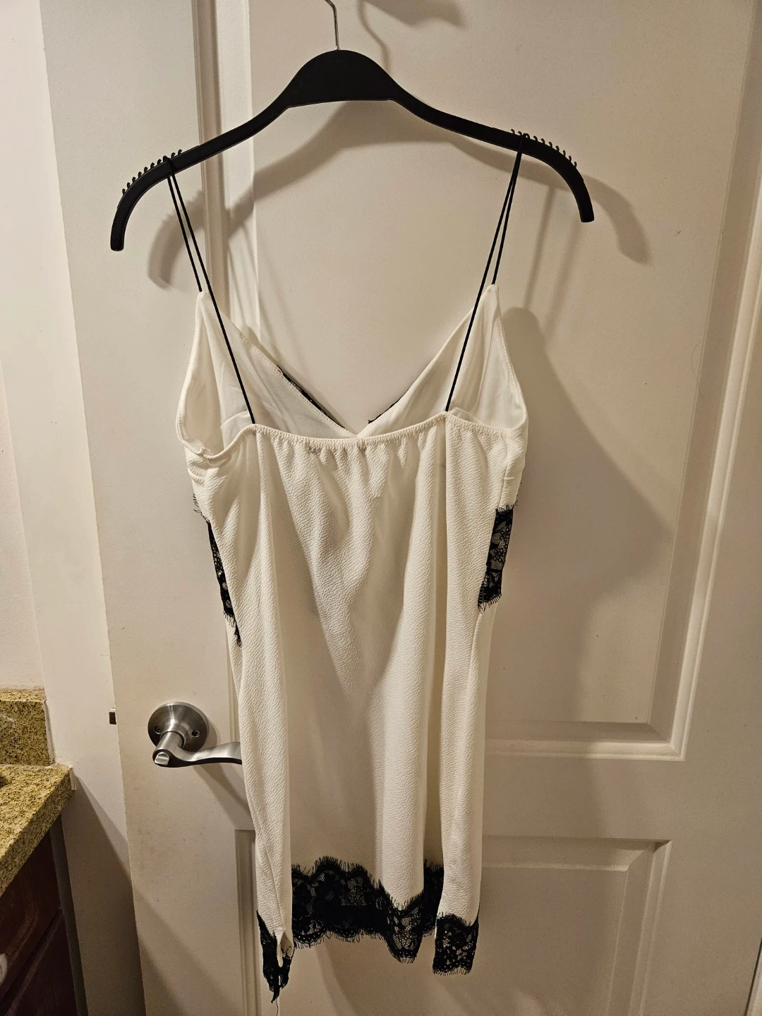 A white slip dress from Glamour Babe with black lace trim detailing. It has adjustable spaghetti straps and a textured fabric. Perfect for a night out!