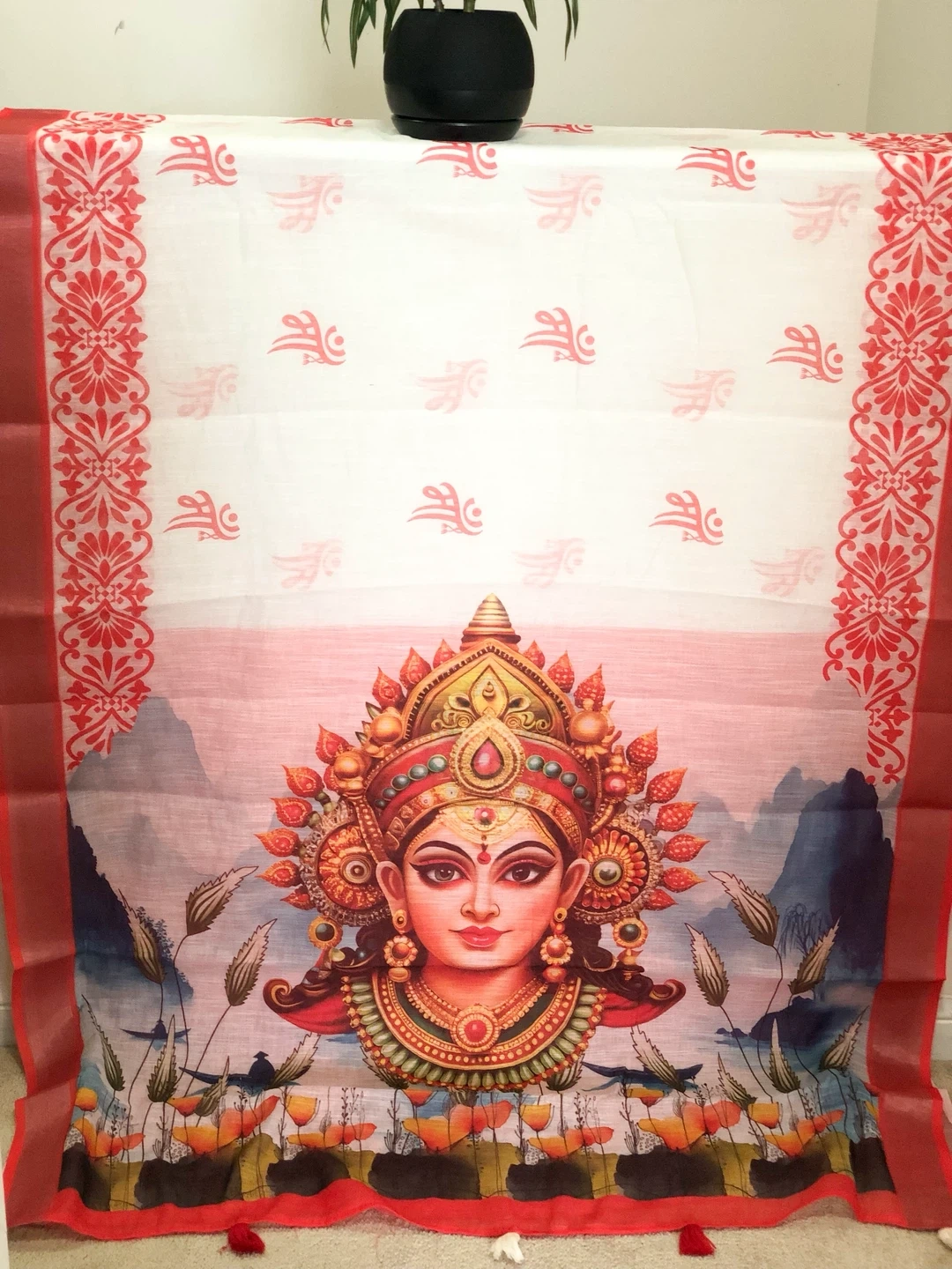 Beautiful women's saree featuring a vibrant red and white design with a prominent goddess print. It's made from lightweight fabric, perfect for cultural events or festive occasions.