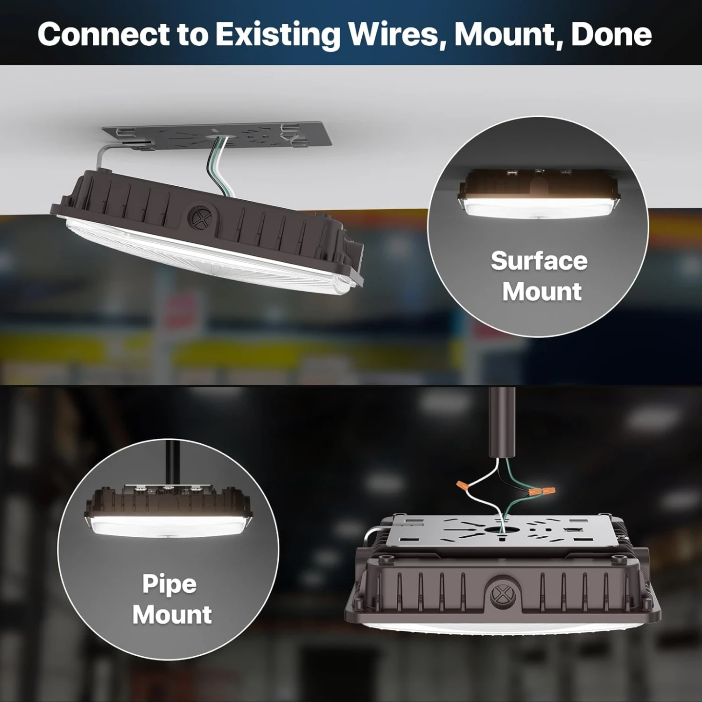 No Electricians: Designed for both surface mounting (with J-box) and pipe mounting (with 3/4" conduit), making installation quick and versatile for any application. (Note: Please ensure waterproofing at conduit joints.)