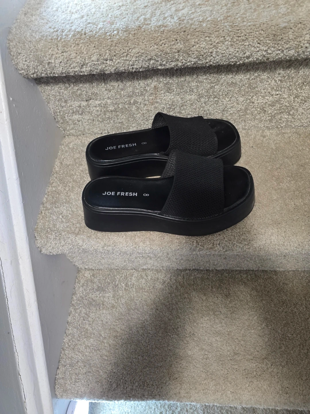 Joe Fresh platform slides in black. These slides feature a textured strap and a comfortable platform sole. Great for casual wear! 15.00 the app wouldn't let me change the price