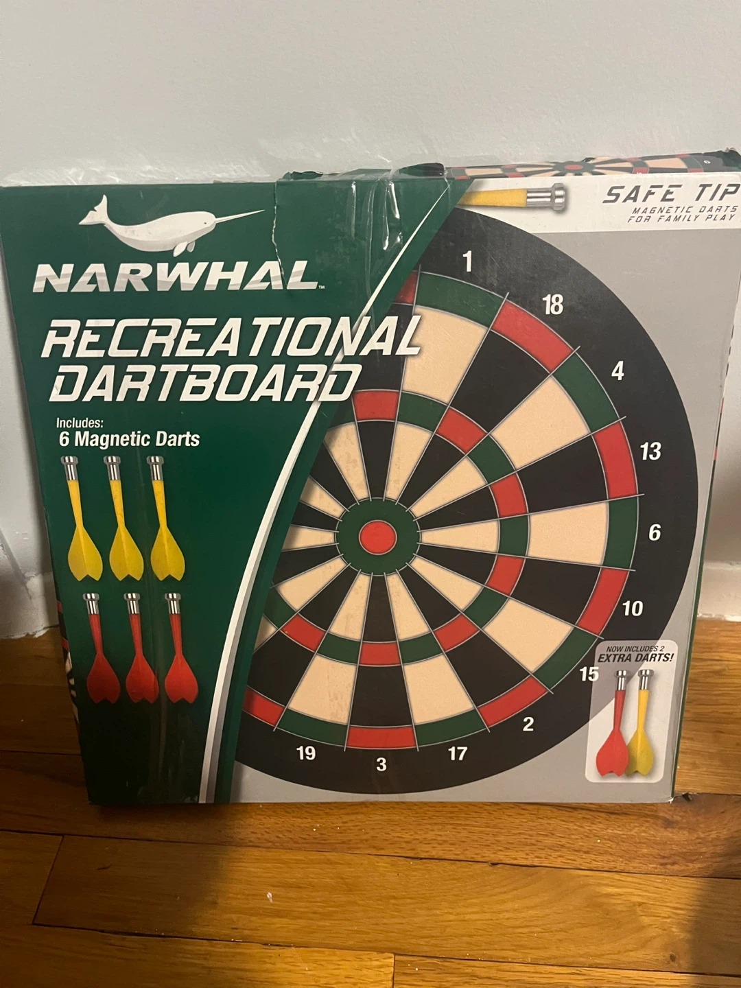 Narwhal Recreational Dartboard includes 8 magnetic darts. Safe tip magnetic darts are designed for family play. A fun addition to any game room!