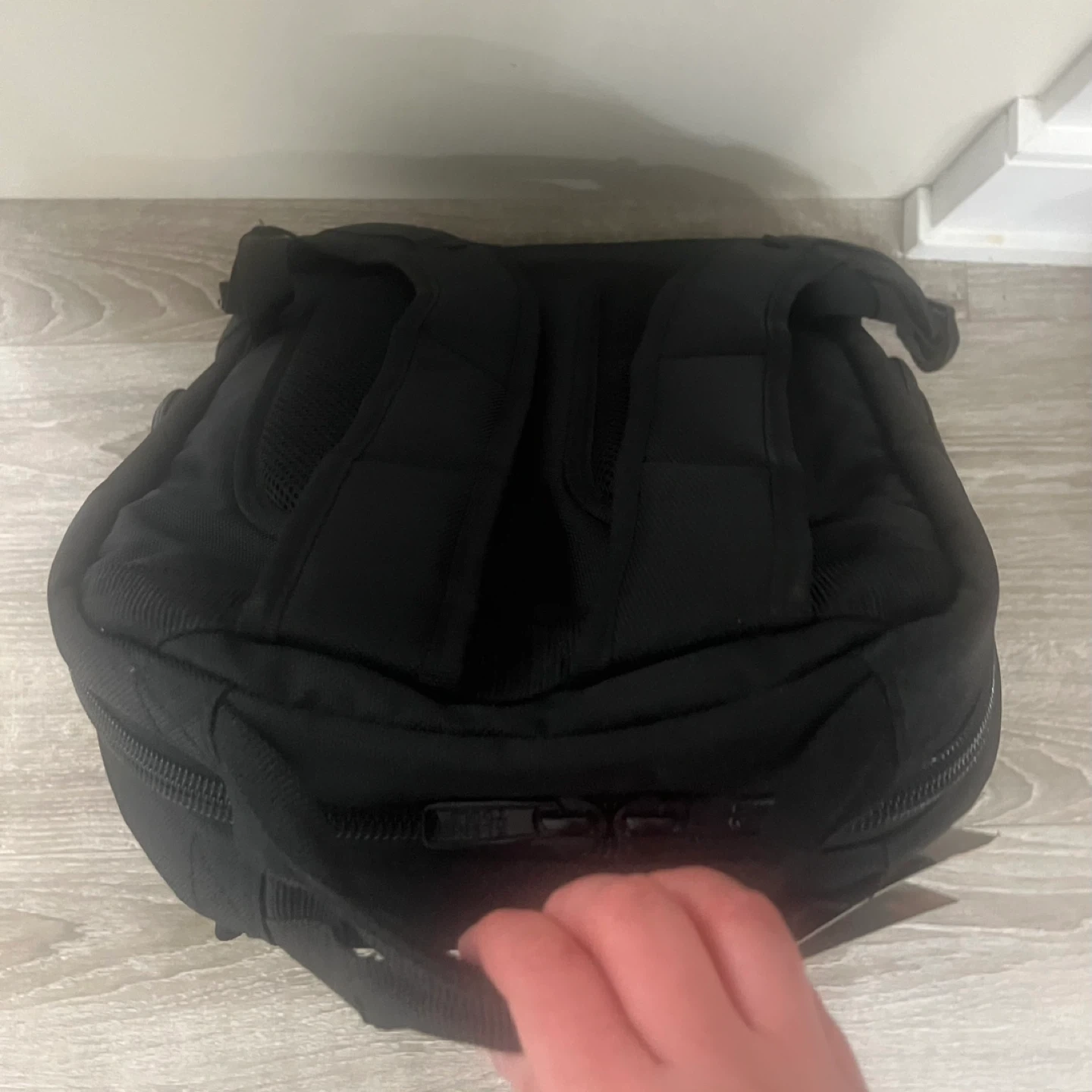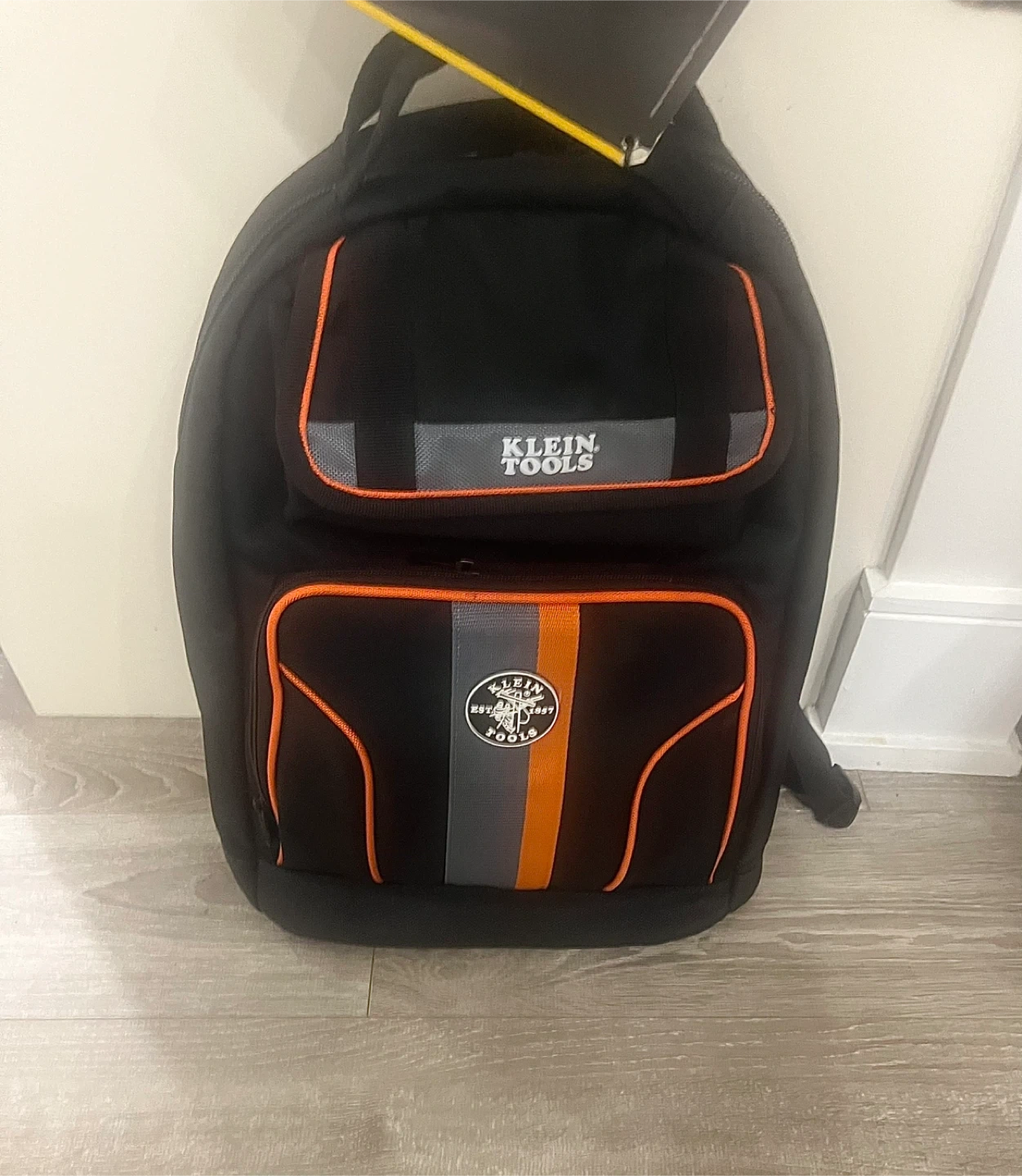 This is a Klein Tools backpack in black with orange accents. It's made of durable material and has padded shoulder straps for comfort. Perfect for carrying tools and gear to the job site!