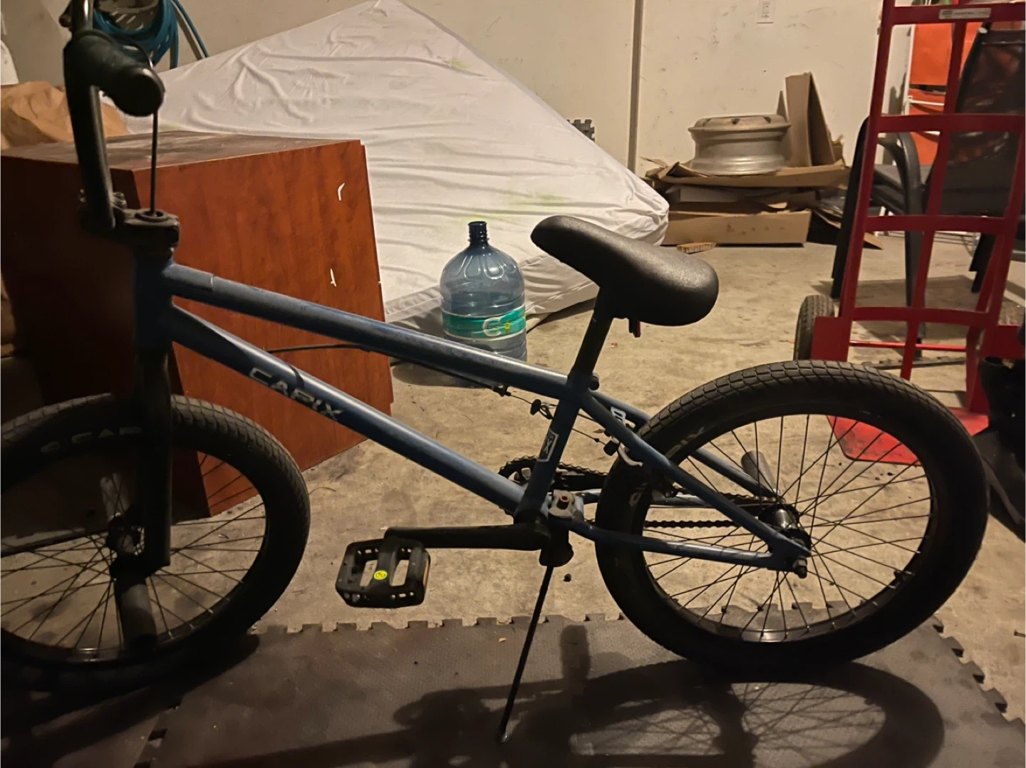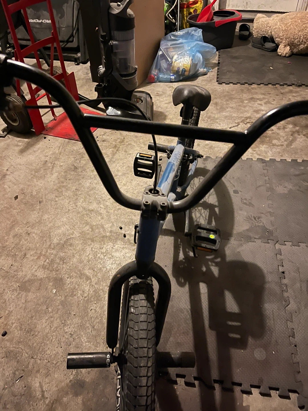Blue Felt BMX bike with black handlebars and seat. It has black pedals and a kickstand. It's a fun bike for riding around!