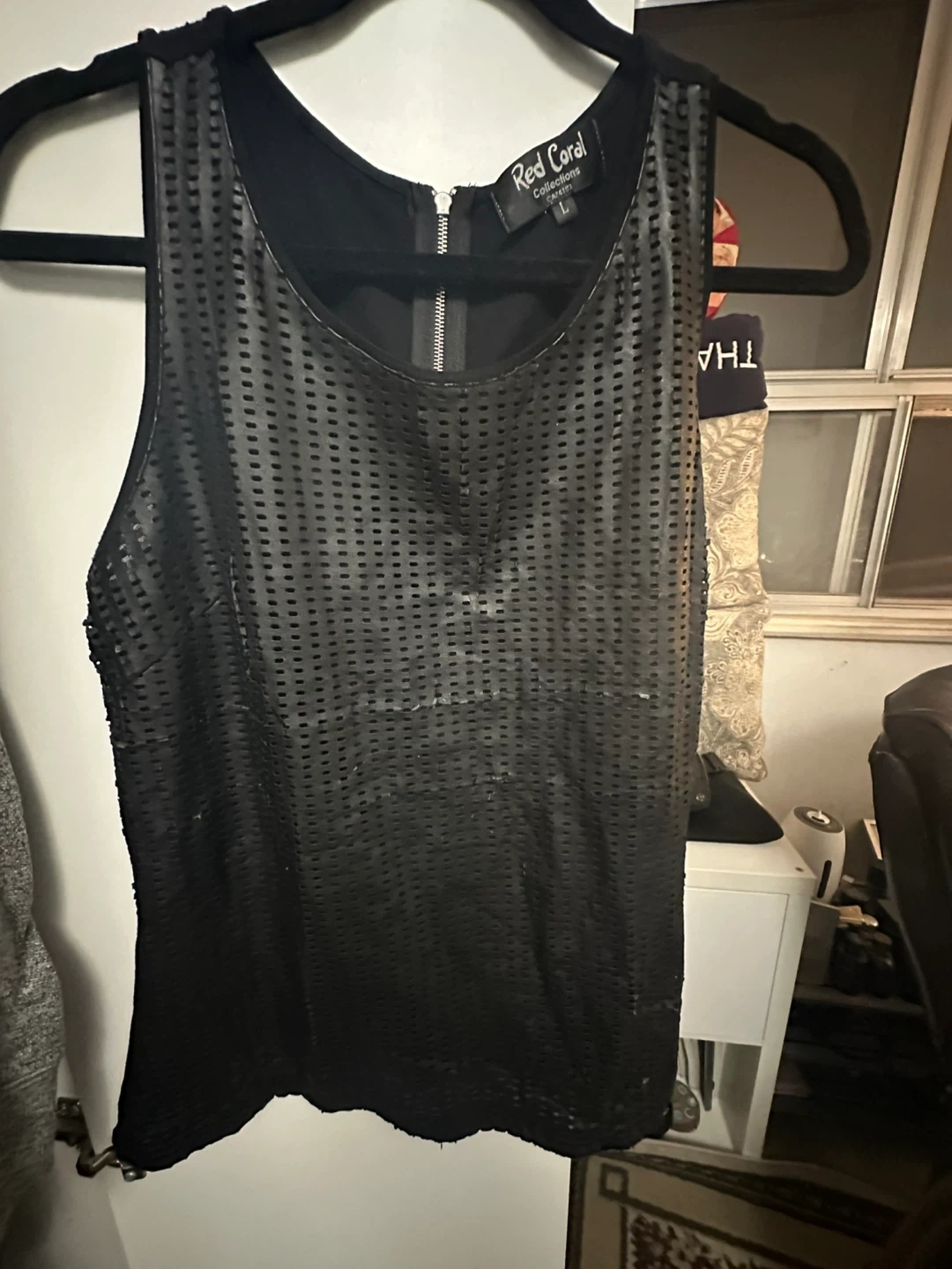 Black sleeveless tank top from Red Coral Collections. It has a perforated overlay and a zipper closure in the back. Size L.