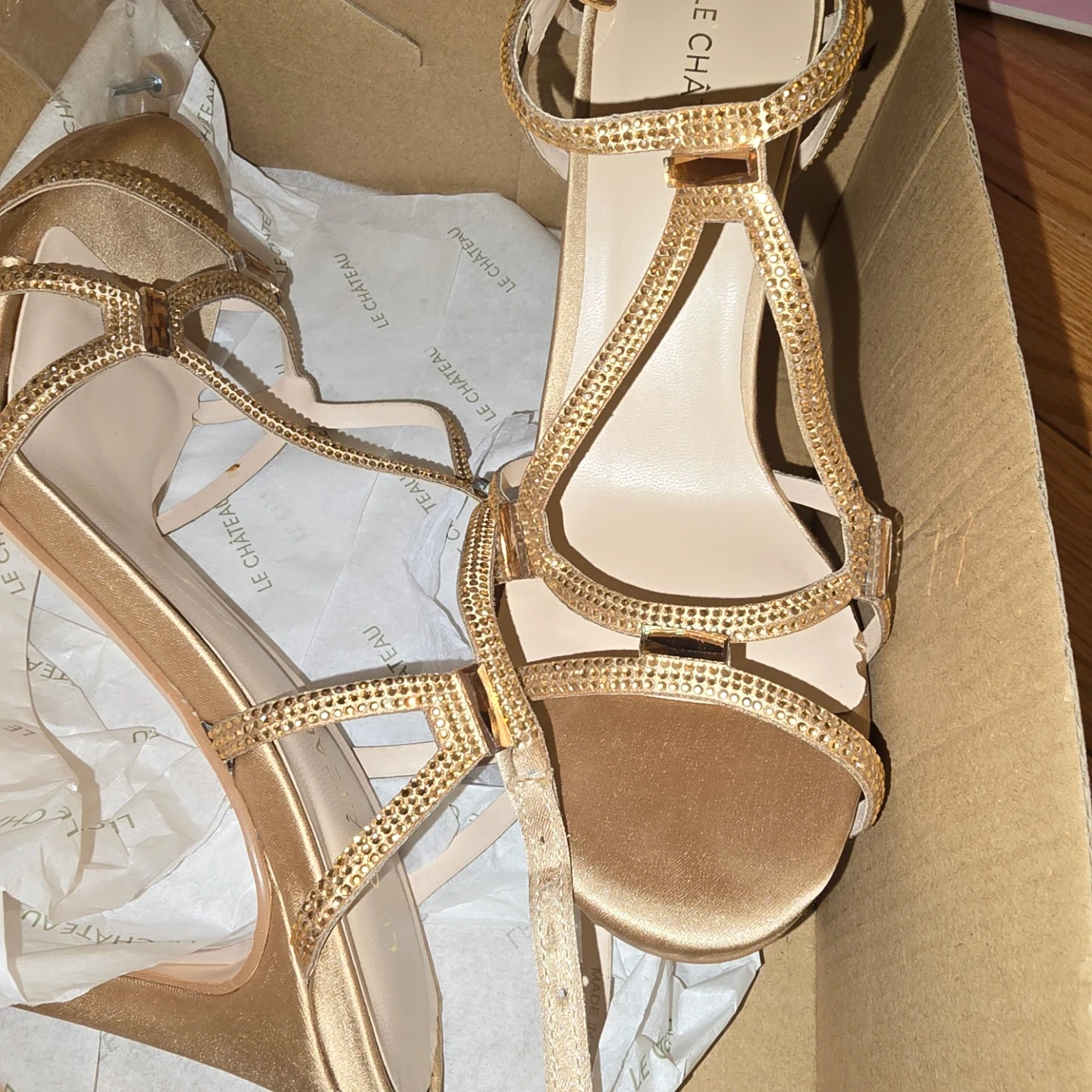 Le Château women's heeled sandals in a gold metallic finish. Features delicate straps embellished with rhinestones and an adjustable ankle strap. Includes original box and a spare heel tip. Size is 36. Brand new never worn