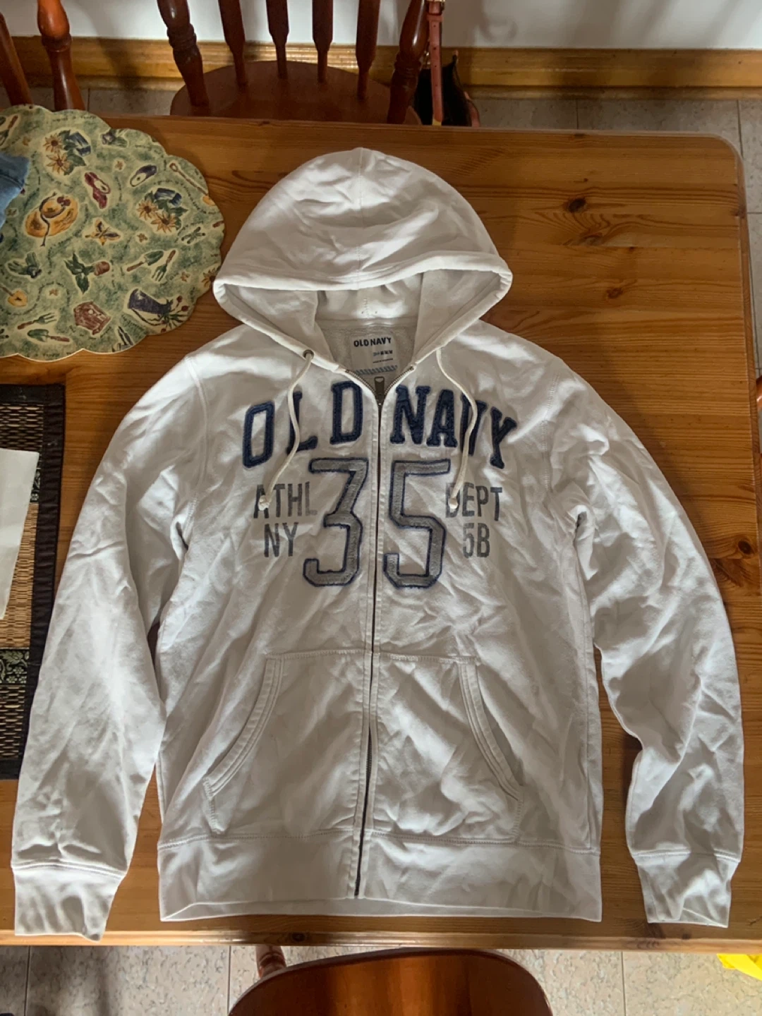 This is a white Old Navy zip-up hoodie. It features a large "35" graphic on the front with "ATHL DEPT NY" text. It's made for comfortable wear. This hoodie is great for casual outings or layering up!