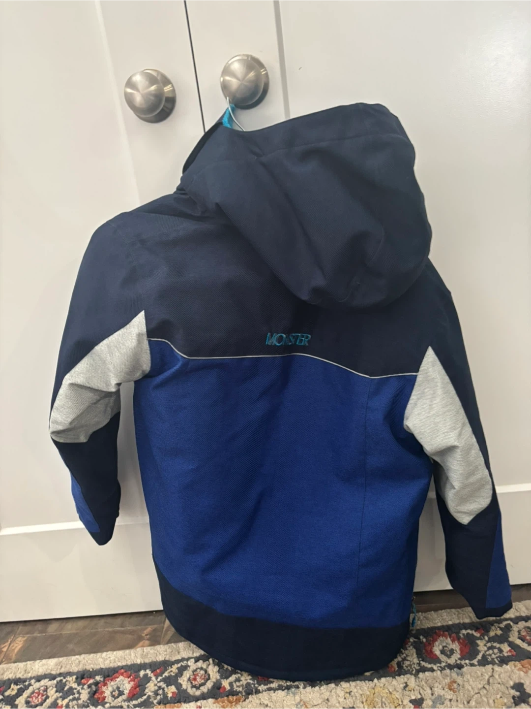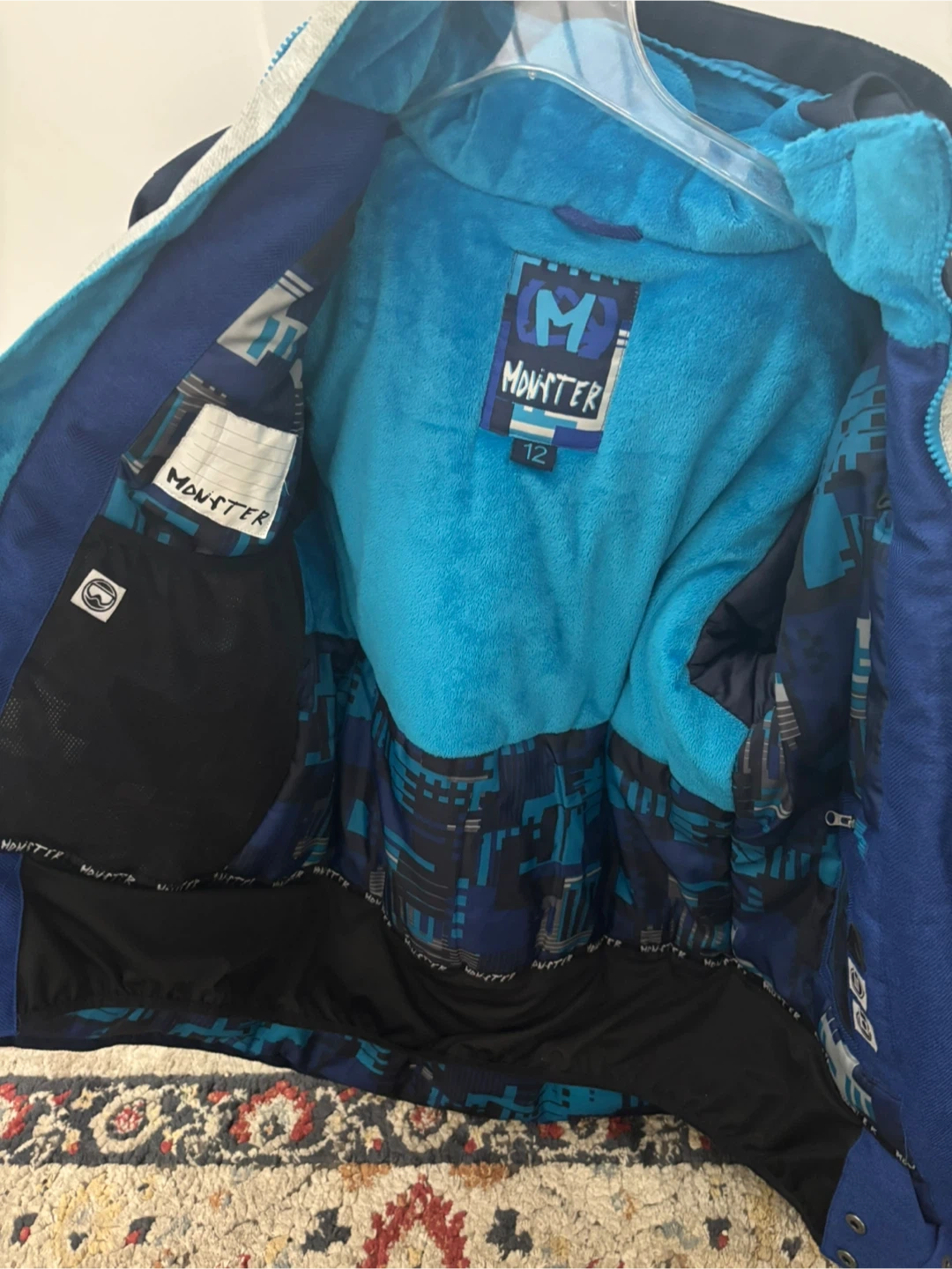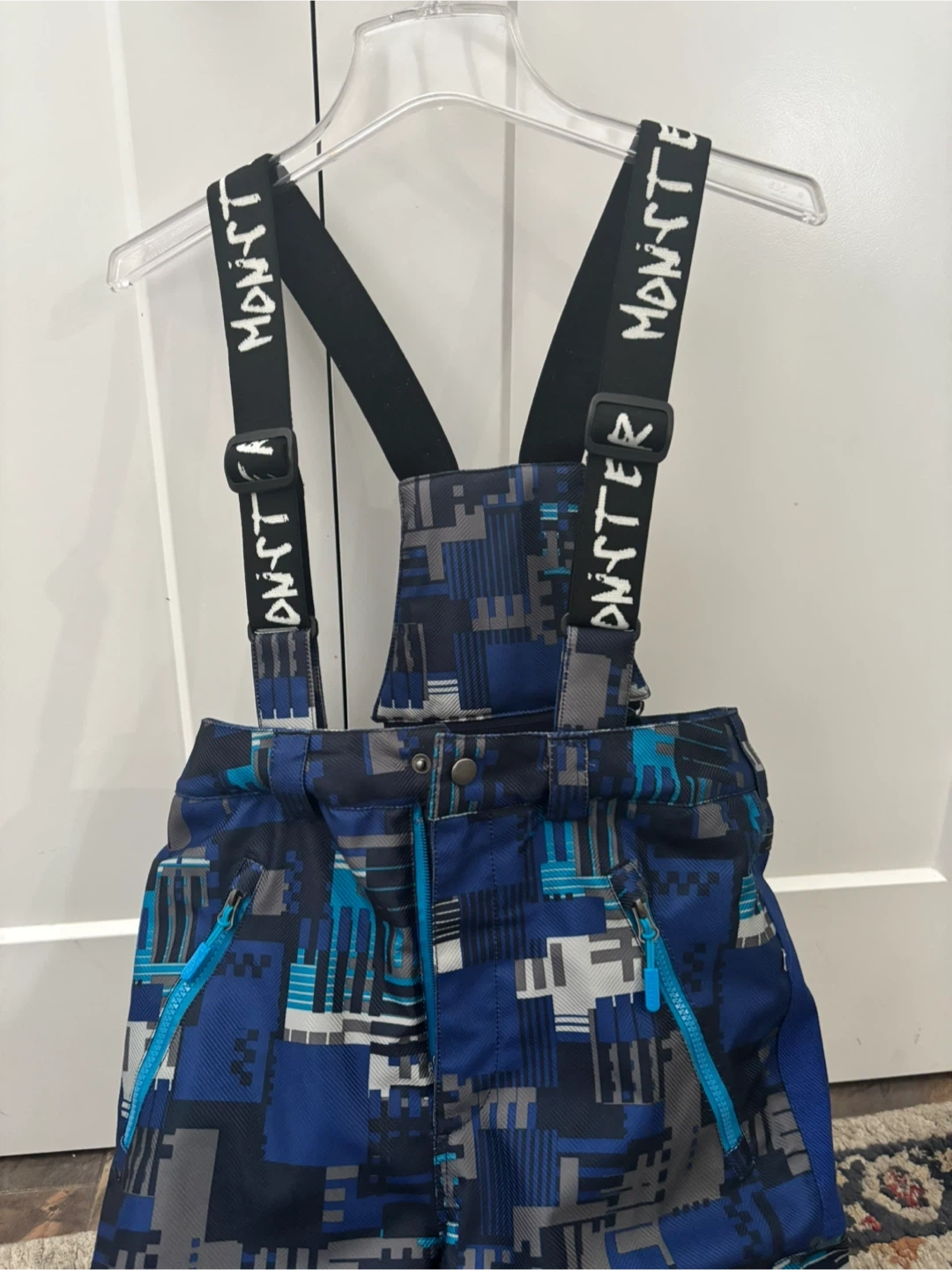 Selling a Monster snowsuit and jacket set for kids, size 12! The snowsuit is blue with a cool geometric pattern and adjustable straps. The jacket is a matching blue, grey, and navy colour block design. Perfect for keeping your little one warm and stylish on the slopes or during winter activities