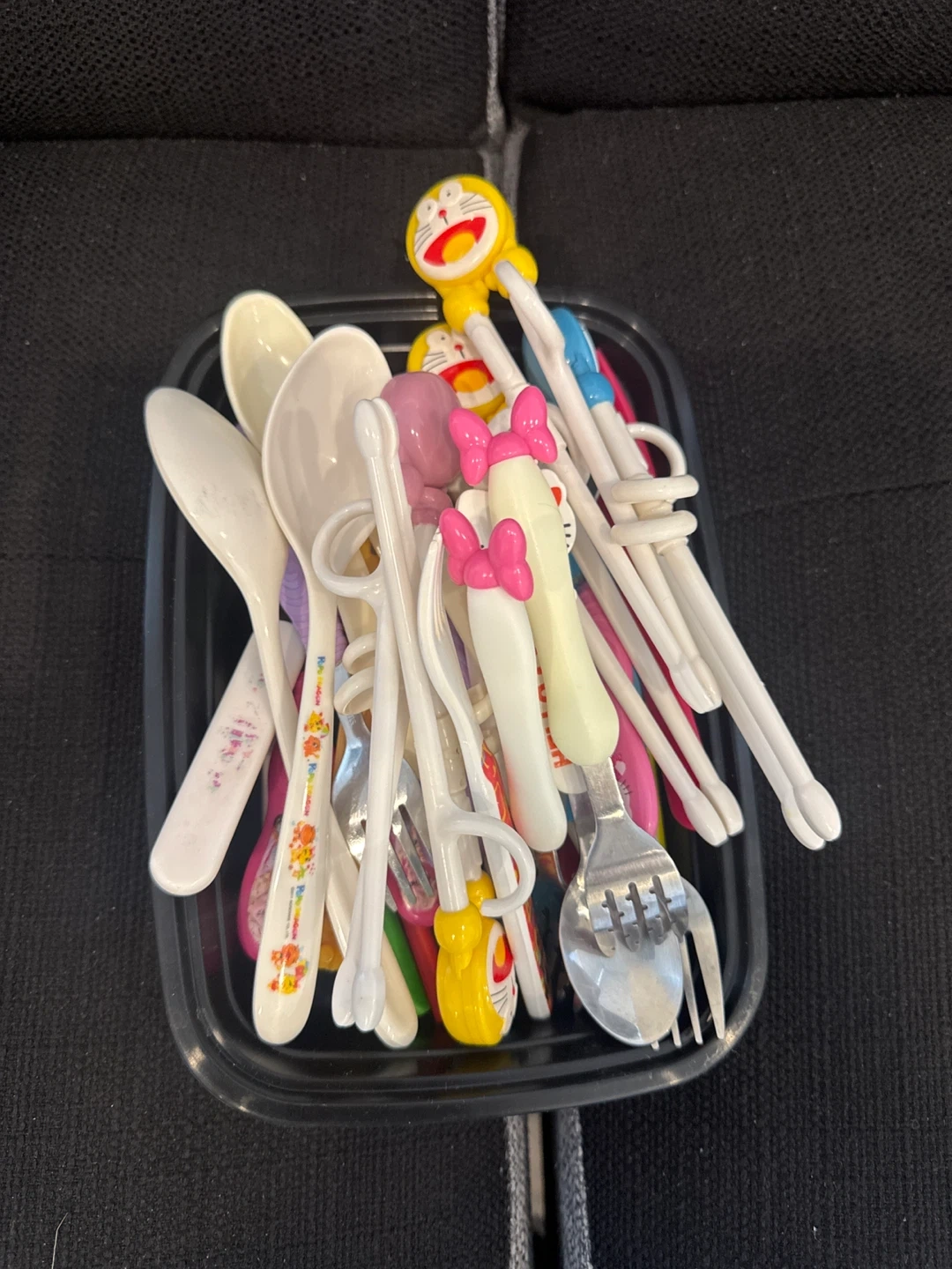 This is a collection of fun kids' cutlery and training chopsticks. It includes several spoons and forks, some with colourful character handles. There are also Doraemon and Hello Kitty themed chopsticks designed for little hands. This set is great for encouraging children to eat independently!