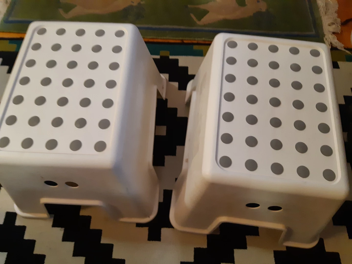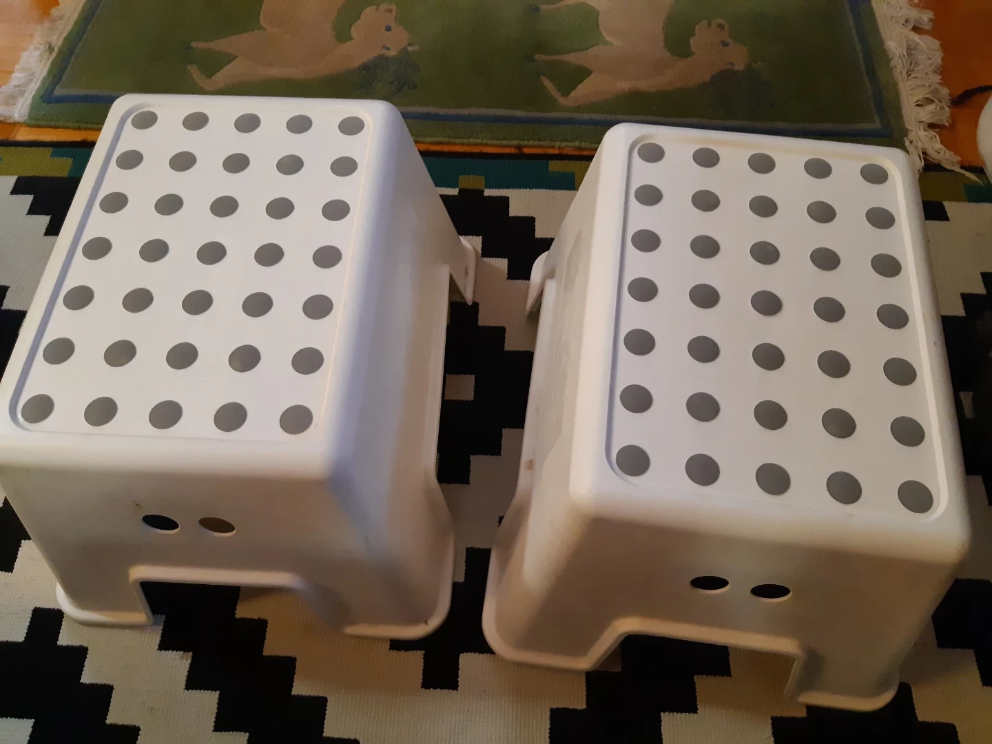 Two white plastic step stools. Grey anti-slip dots on top. Lightweight and easy to store. Ideal for children or reaching high places. $10 each or both for $15.
