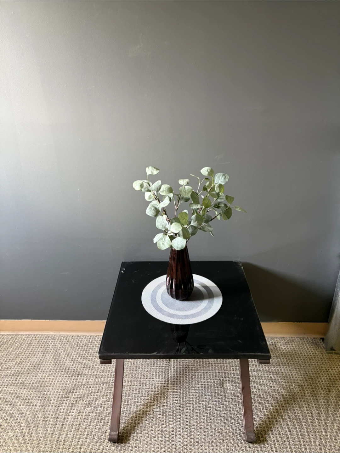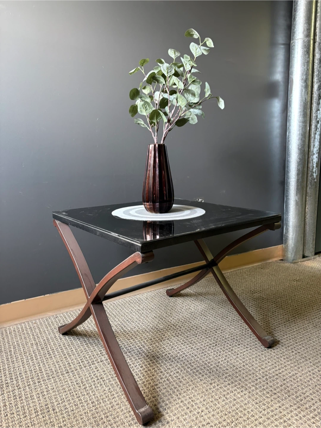 A stylish side table with a glossy black glass top and a unique X-shaped metal frame. Made with tempered glass.