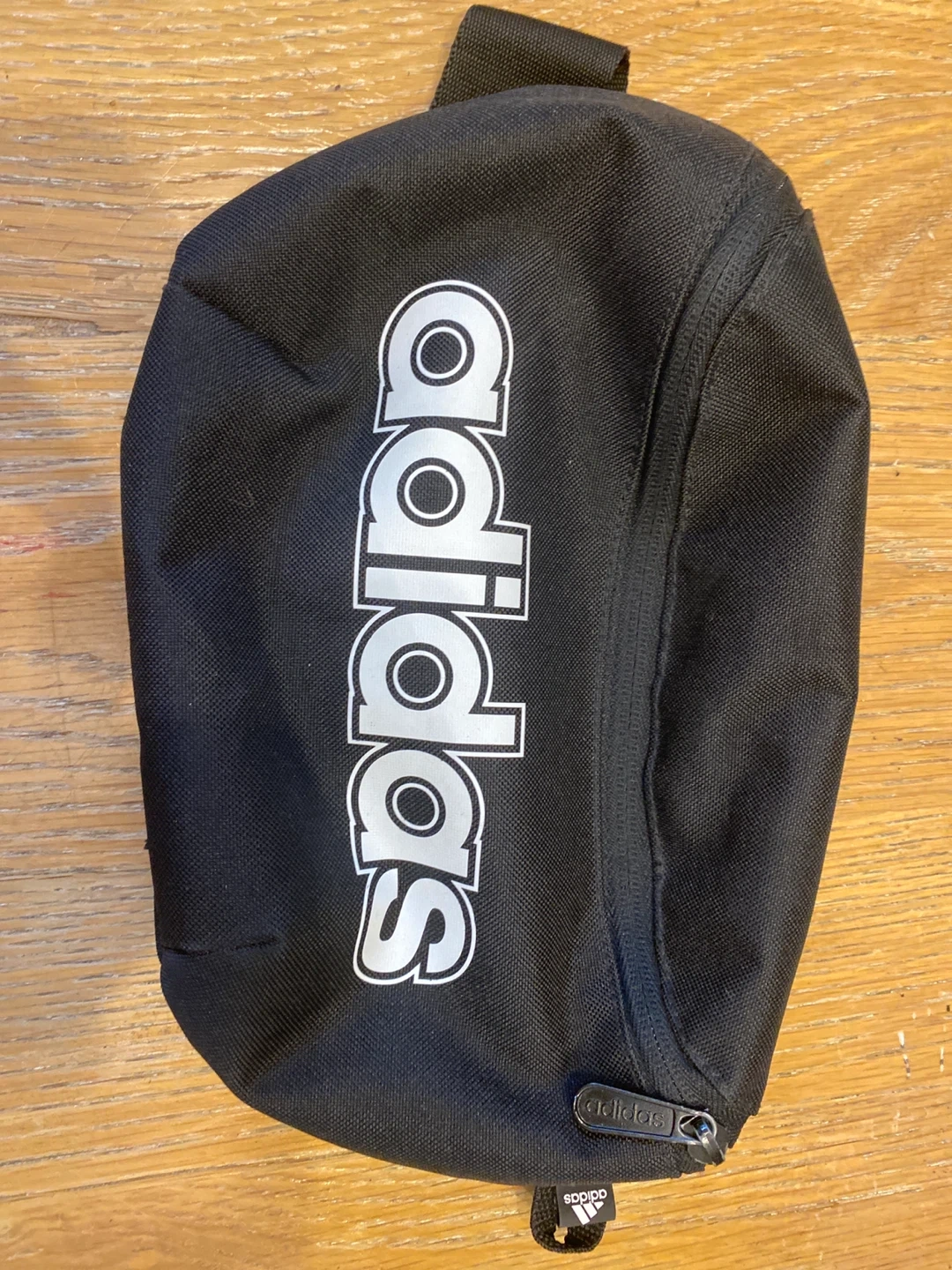 This is a black Adidas fanny pack. It's made of durable fabric and features a main zippered compartment. The adjustable strap makes it comfortable to wear around your waist or across your chest. It's useful for keeping essentials handy while on the go.