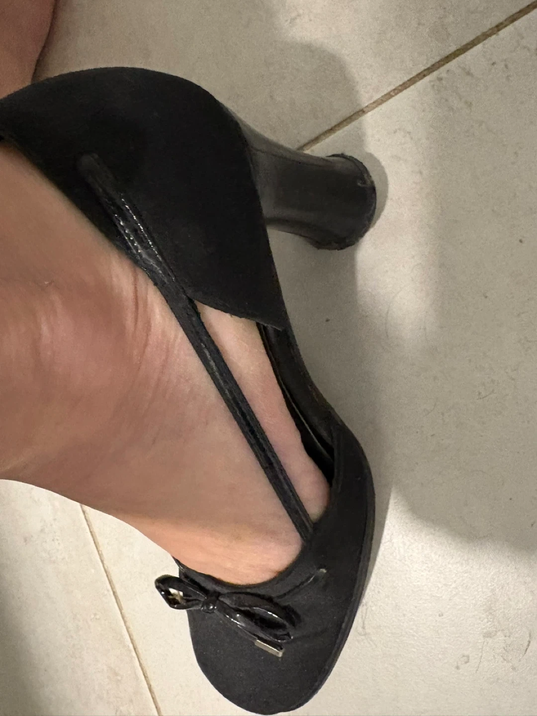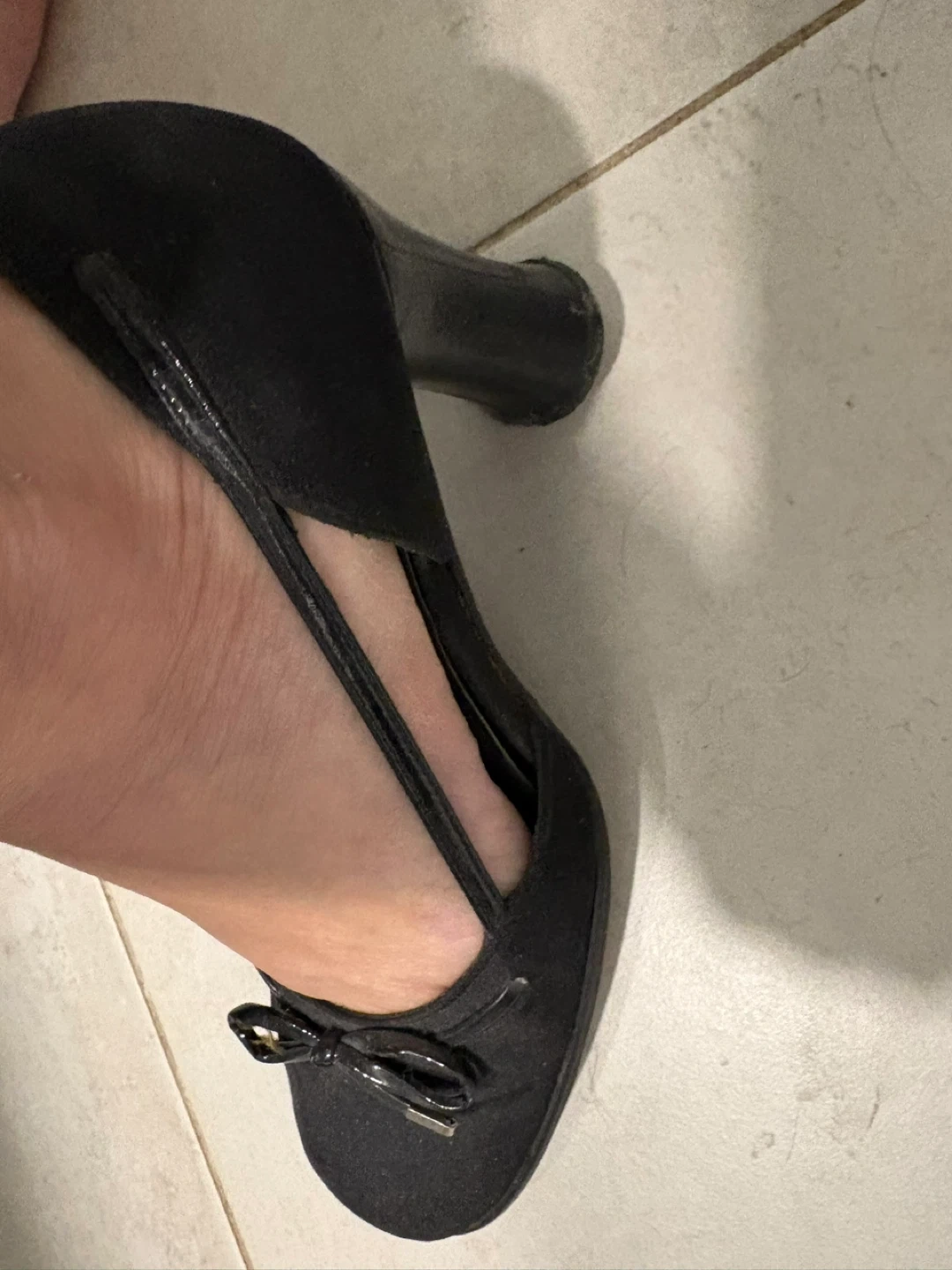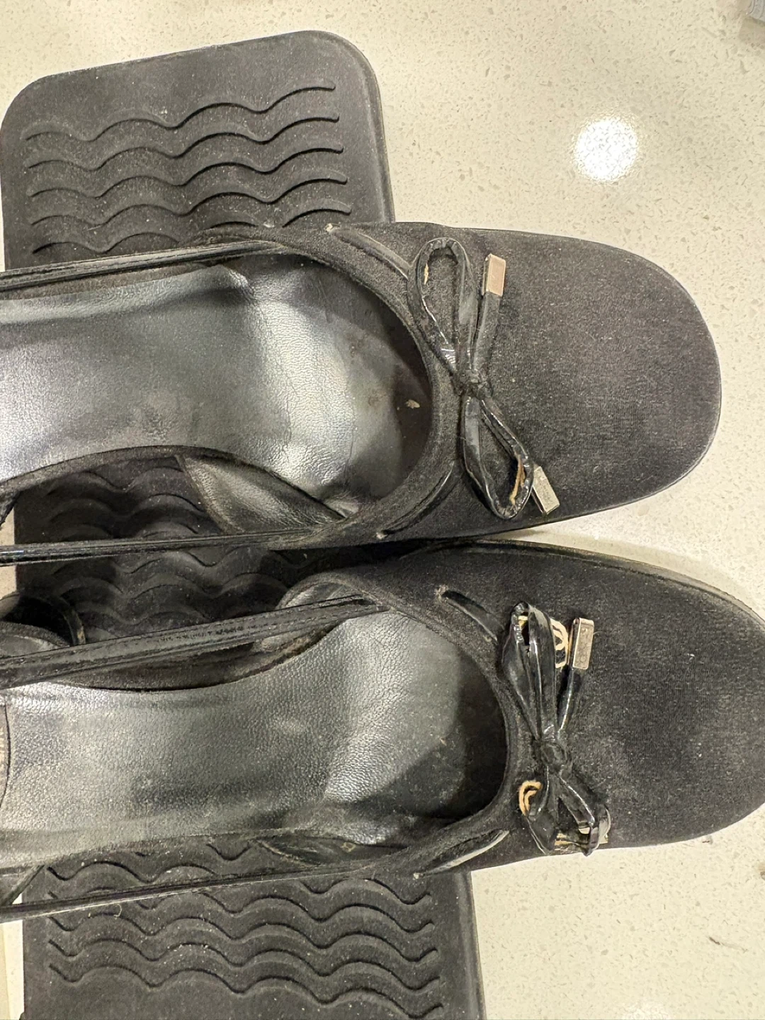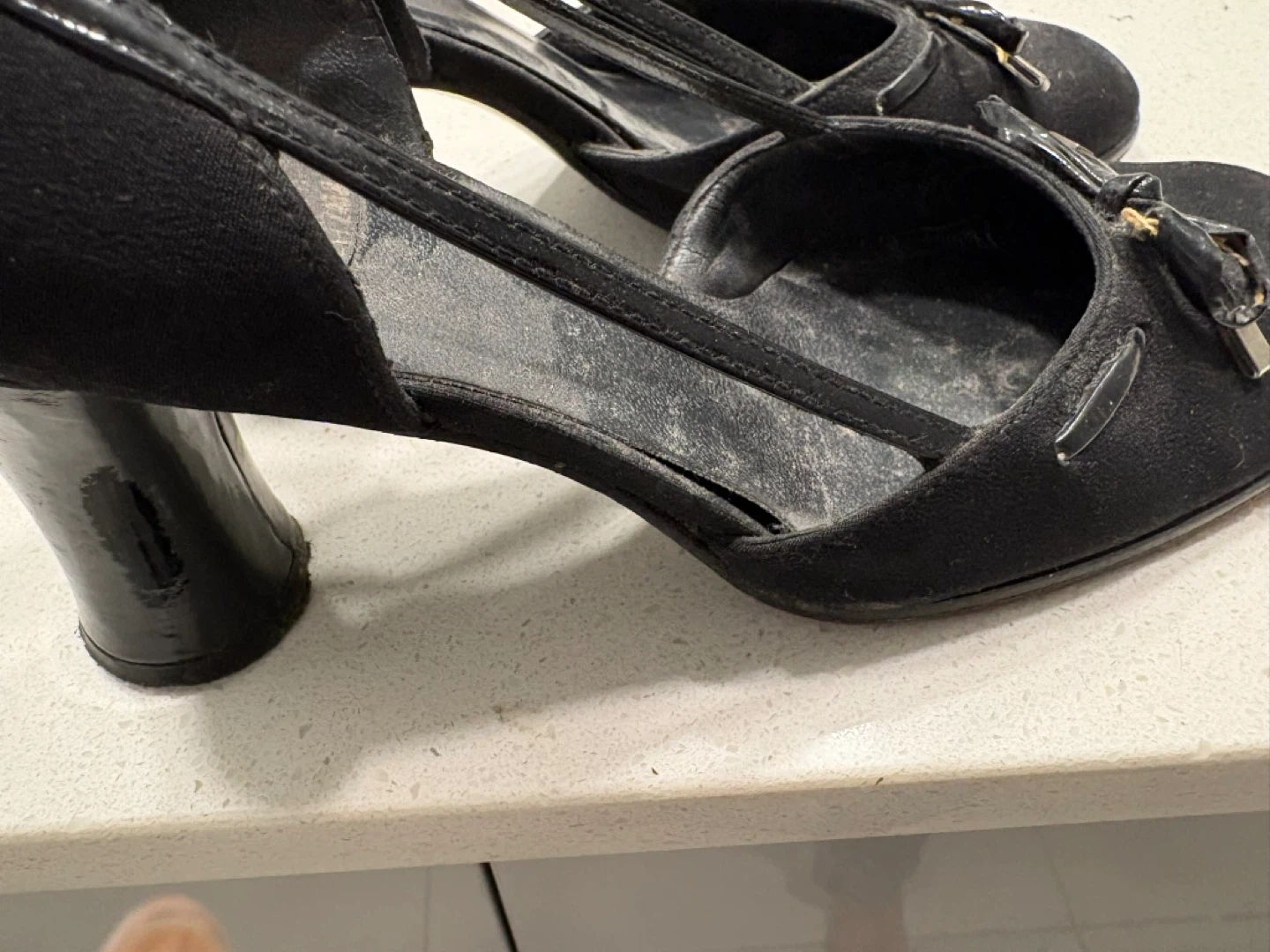 Black suede heeled shoes with a decorative bow. Features a classic pump silhouette with an ankle strap. Heel height approximately 3 inches.