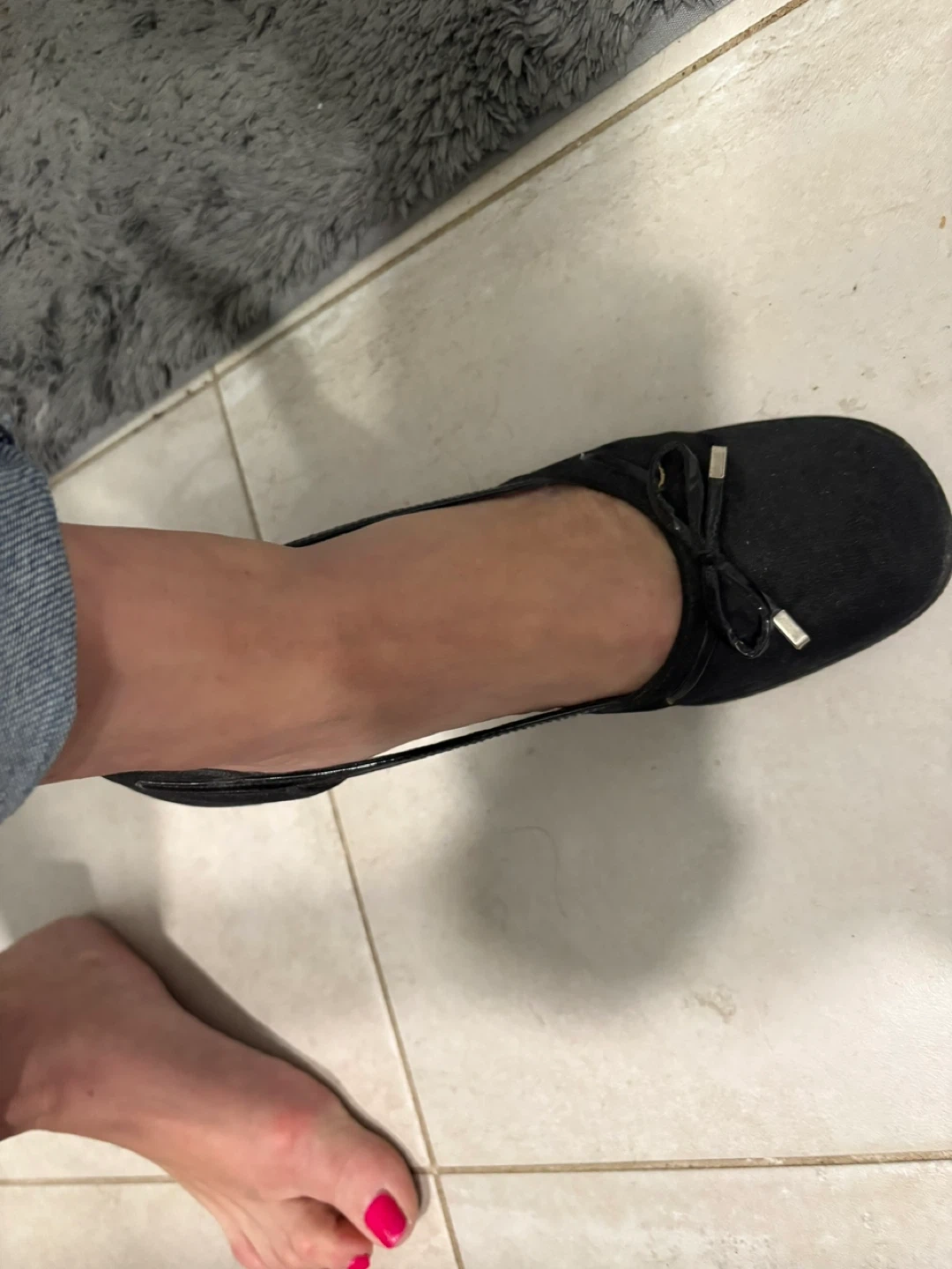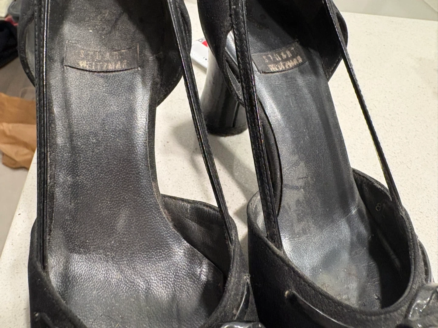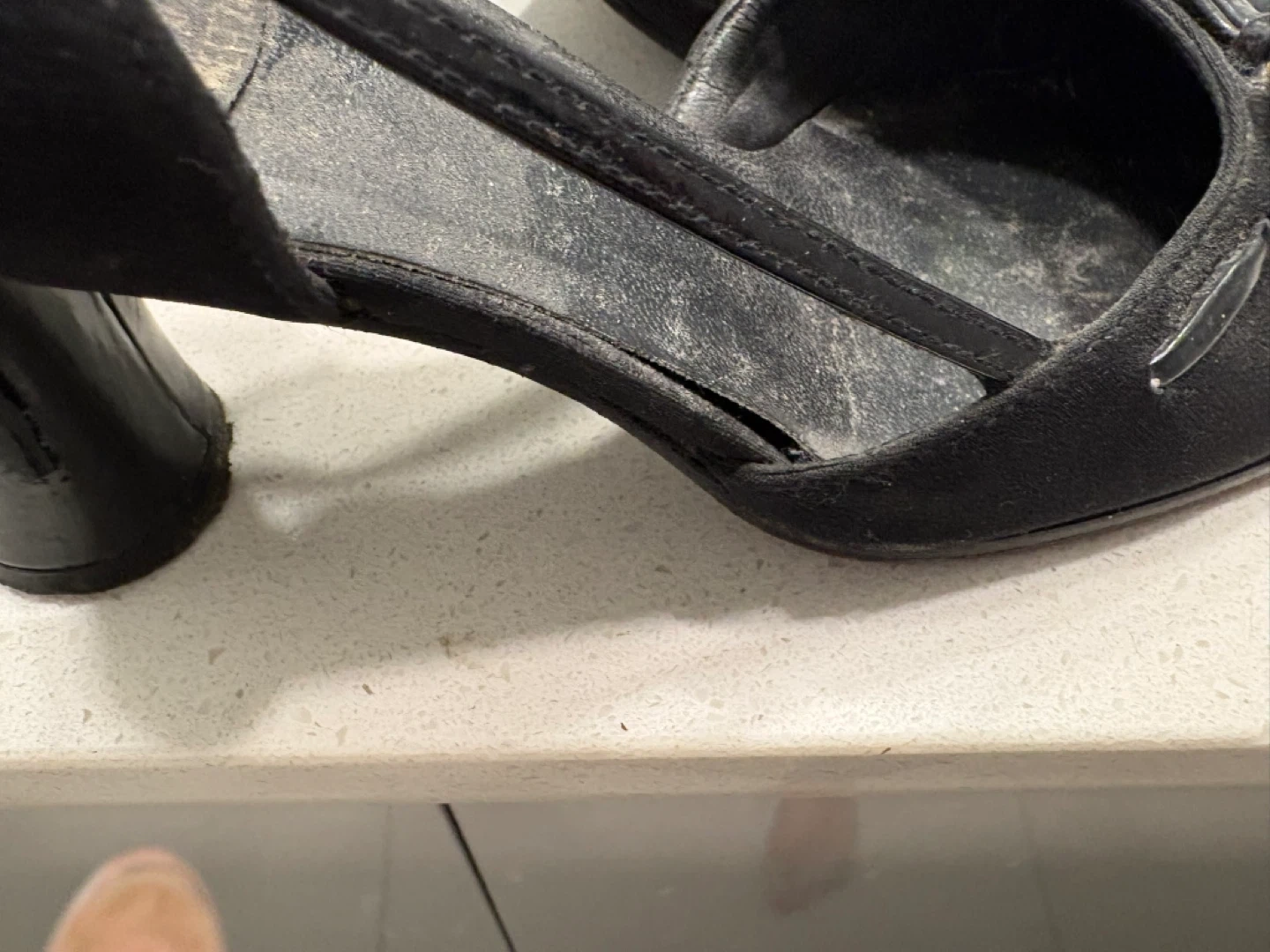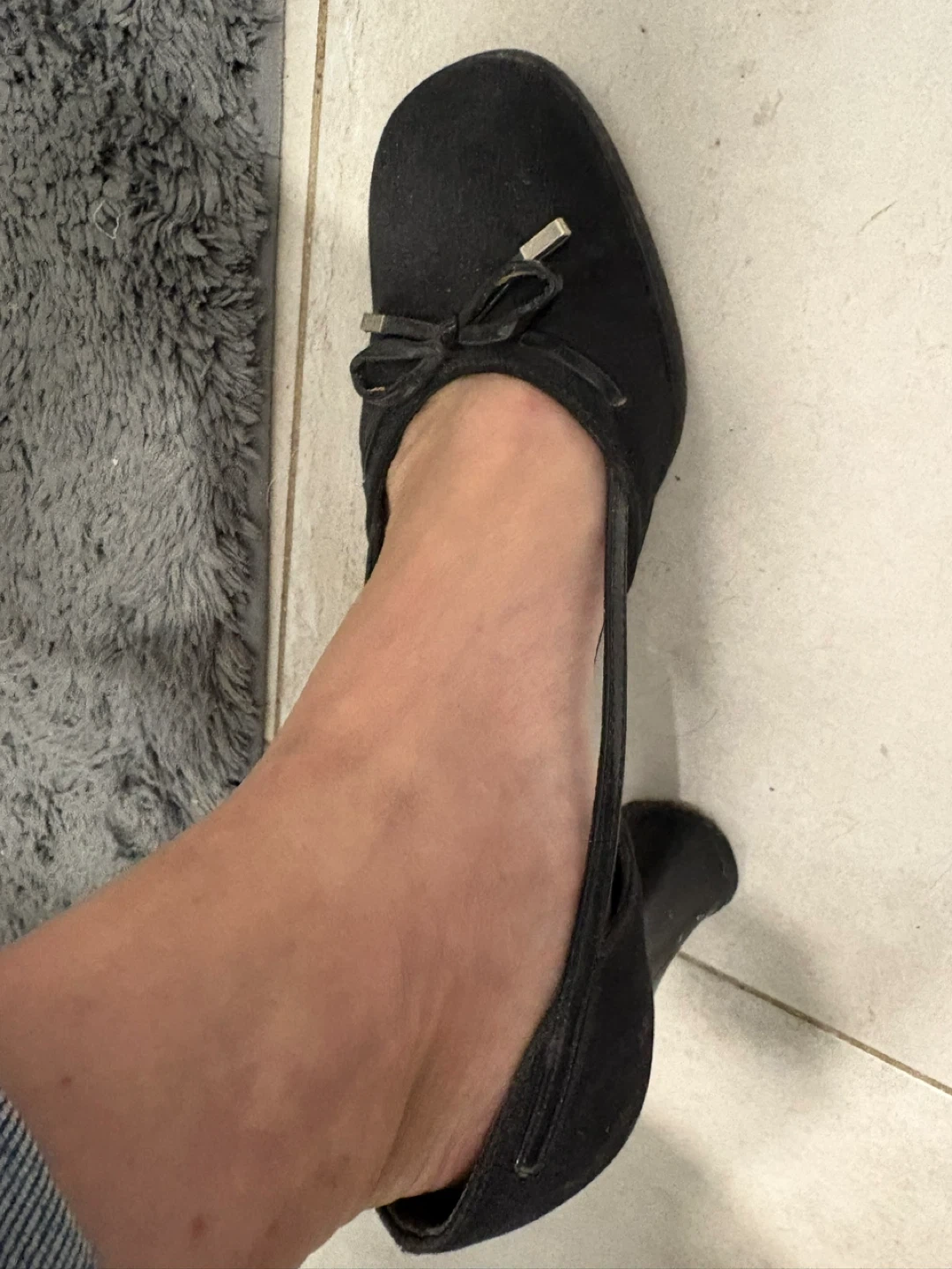 Black suede heeled shoes with a decorative bow. Features a classic pump silhouette with an ankle strap. Heel height approximately 3 inches.