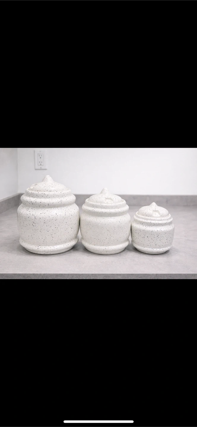 This set includes three white ceramic canisters with a speckled finish and decorative lids. They're great for storing kitchen essentials. Ceramic material.