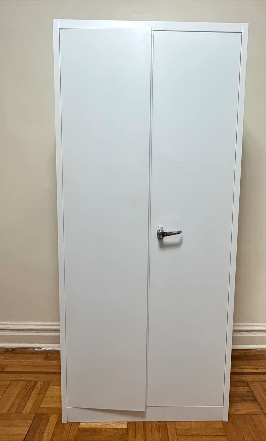 This is a white metal storage cabinet. It features multiple adjustable shelves and a hanging rod for clothes. The cabinet has double doors with a latch closure. Great for organizing garages, offices, or closets!
