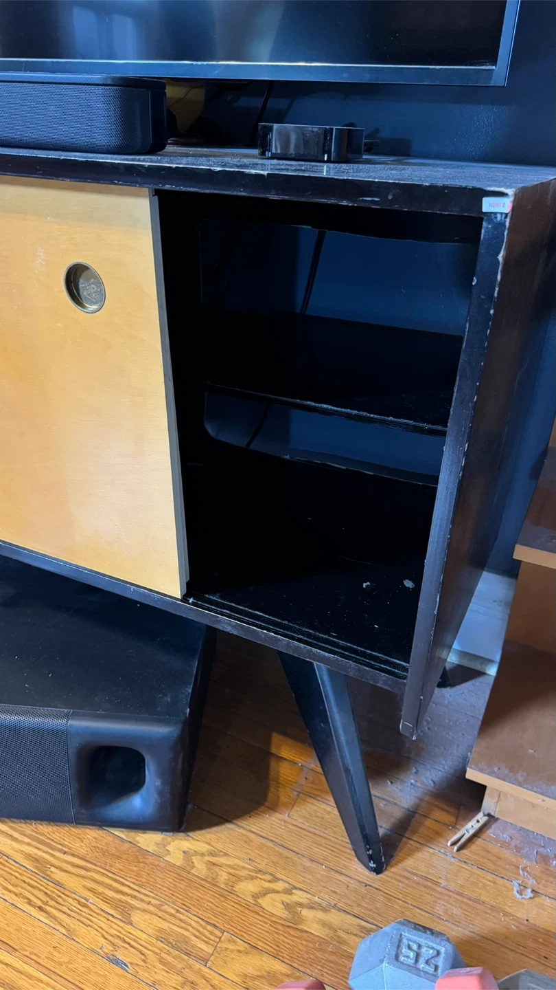 Some damage on the side, can be glued into place. The back panel has been cut open for cables and other electronic components.