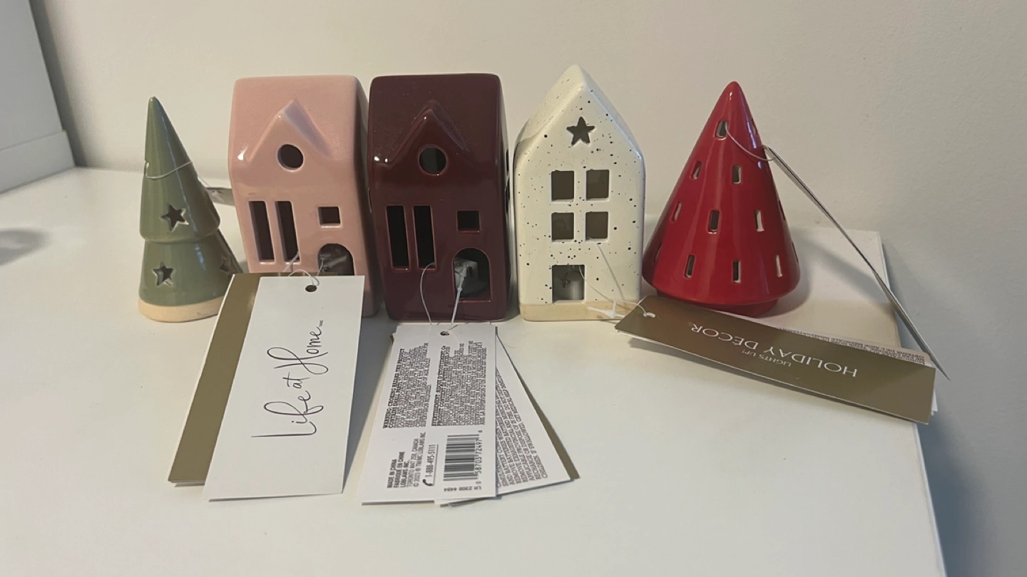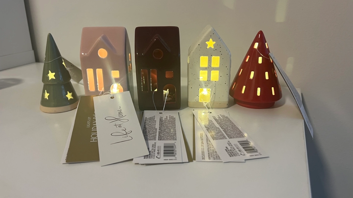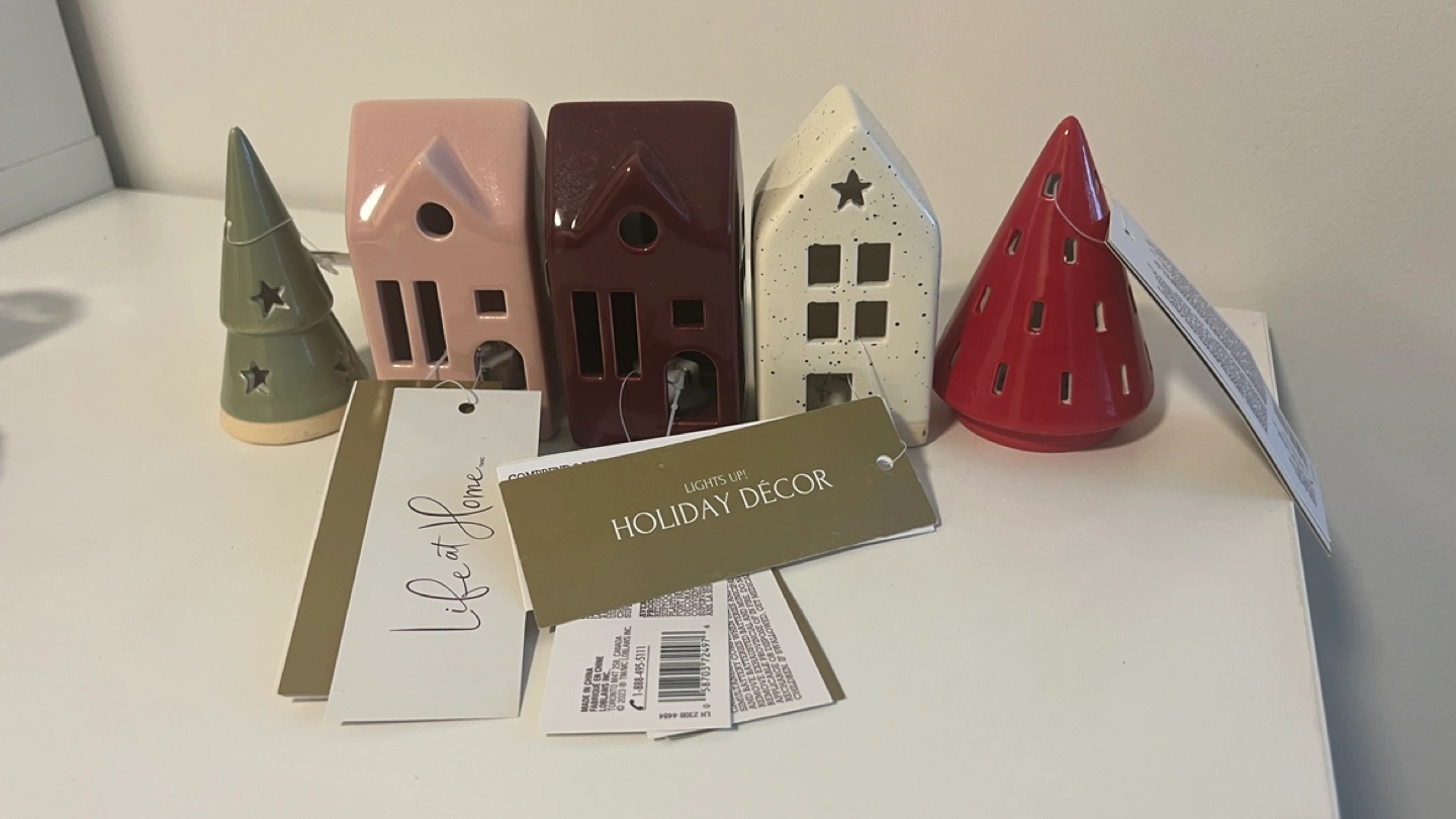Adorable set of five ceramic holiday decorations. Includes three houses and two trees. Each lights up. Perfect for festive decor.