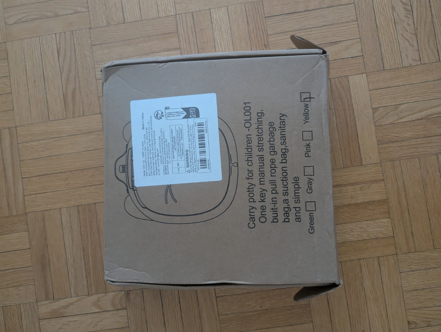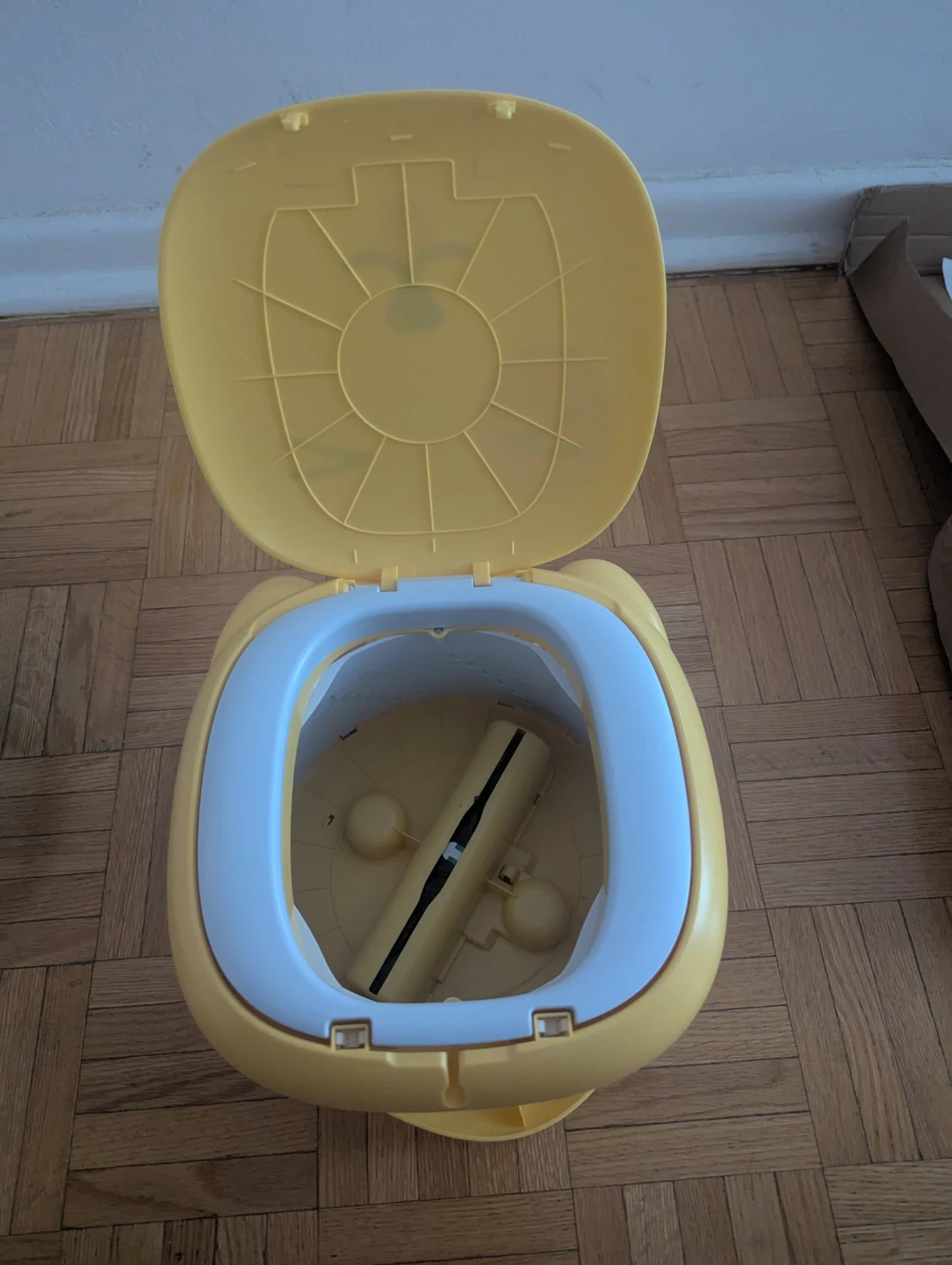 This is a cute yellow portable potty seat designed for children. It's made of plastic and features a fun animal face design. It comes with instructions for use.