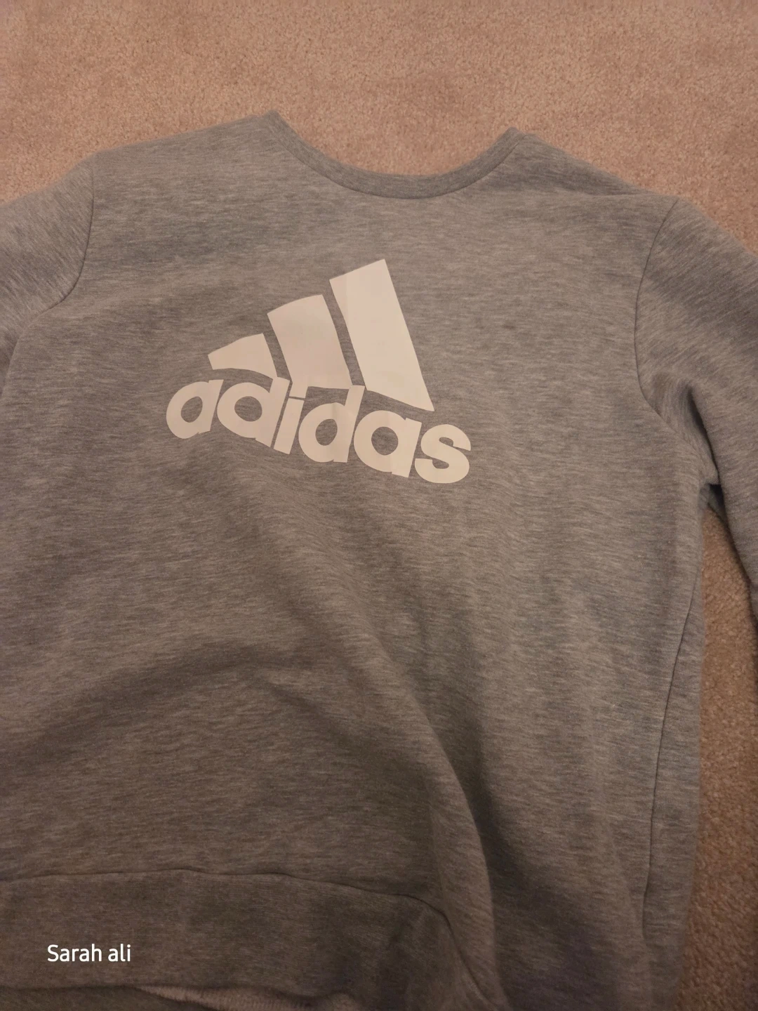 A comfy grey crewneck sweatshirt with the classic Adidas logo. It's made from a soft cotton blend. This sweatshirt is suitable for everyday wear.