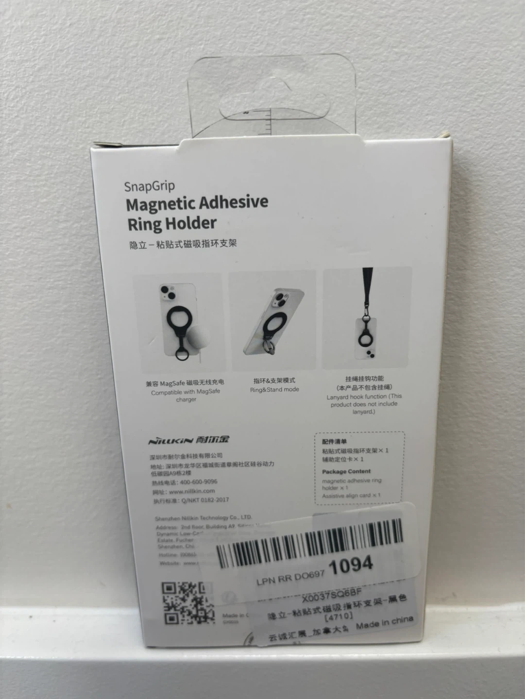 SnapGrip Magnetic Adhesive Ring Holder for phone. This ring holder also functions as a stand and includes a lanyard hook. Package content includes the ring holder and an assistive align card.