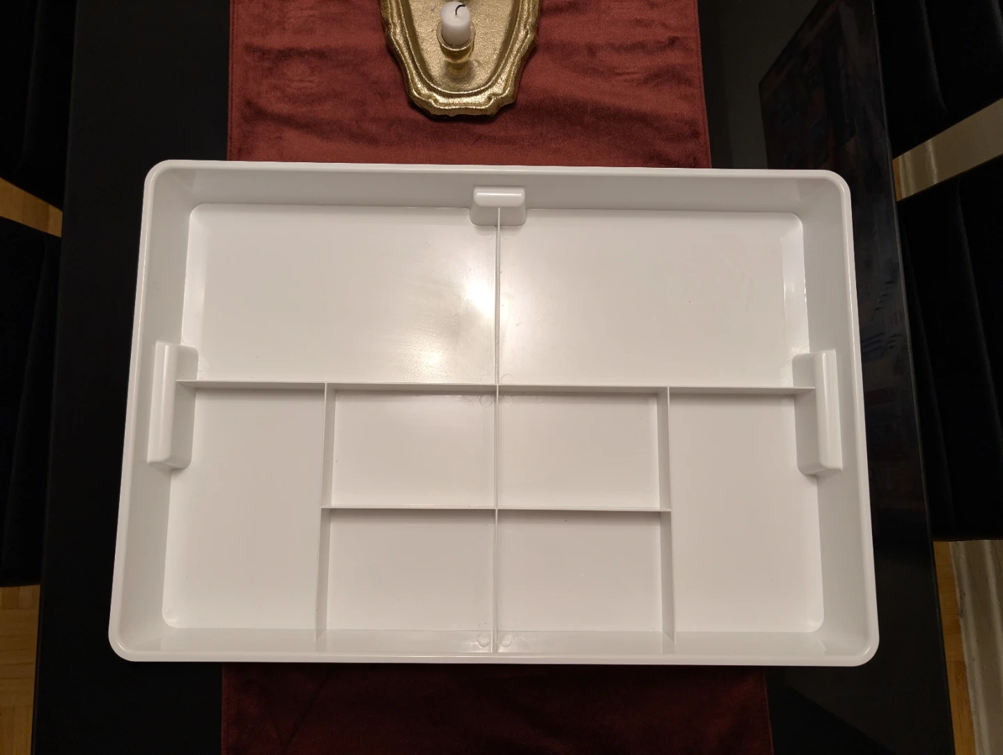 This is a white IKEA KUGGIS insert with 8 compartments. It's designed for organizing various items like drug or messy drawers. Purchased for $18.99 + tax