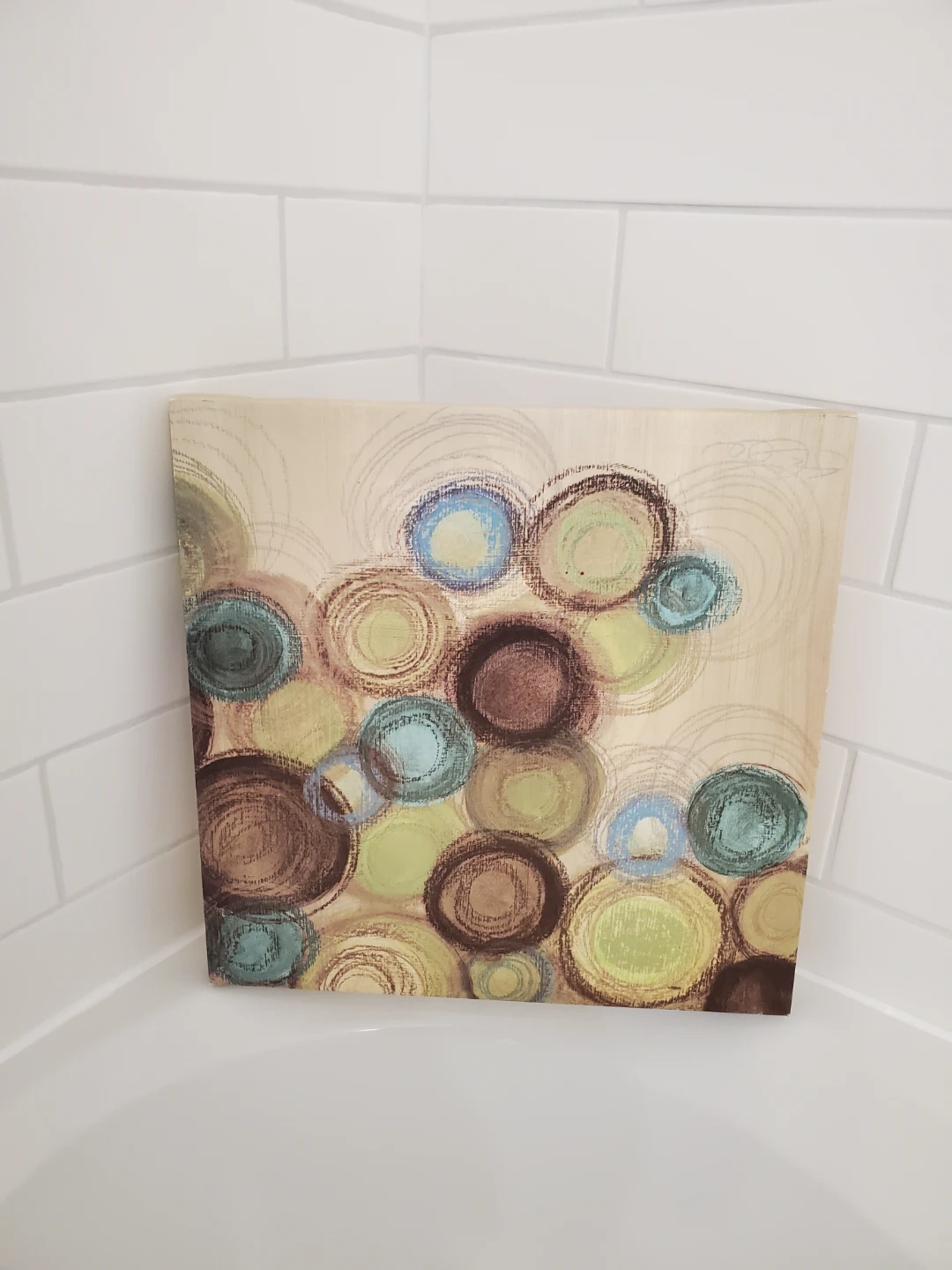 This canvas art features a modern abstract design with overlapping circles in various earthy tones and blues. The artwork is printed on canvas and ready to hang. It's a nice piece for adding a touch of colour to any room.