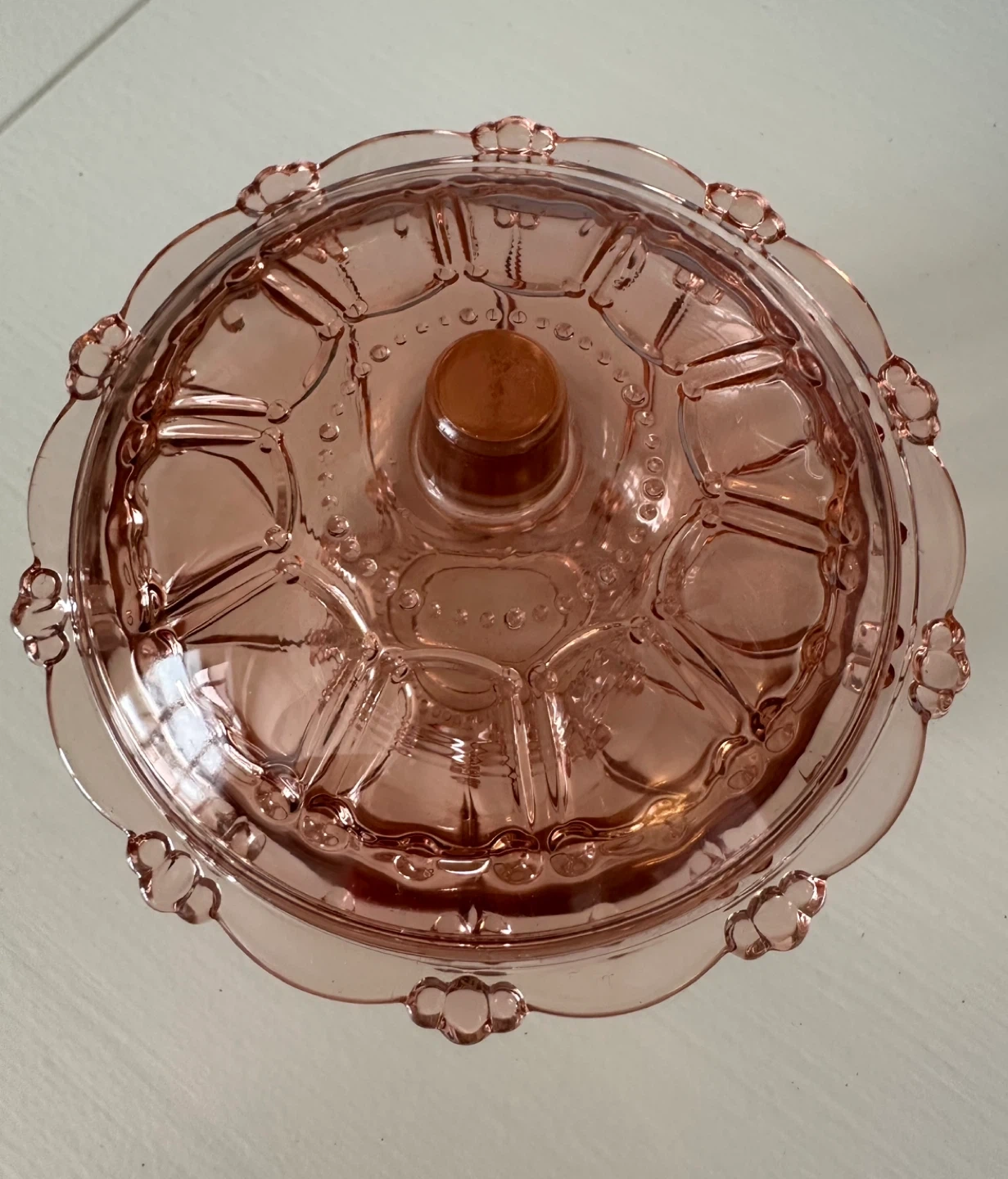 This particular pink covered candy dish has a detailed ribbed pattern and scalloped edges. It has the KIG Indonesia mark. It is from the mid-20th century. It measures 5” wide and approximately 4” tall. Don’t miss out on this beautiful piece! Pick up Windsor Park, cross posted.