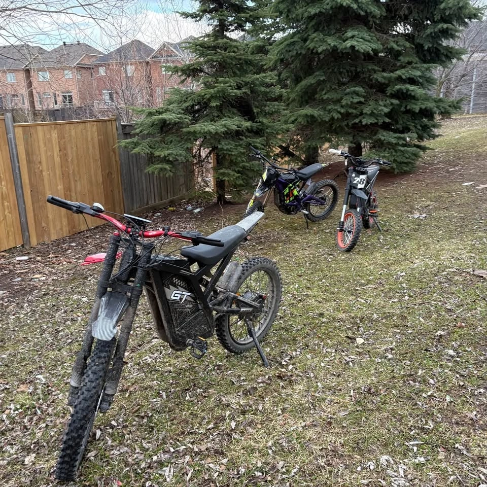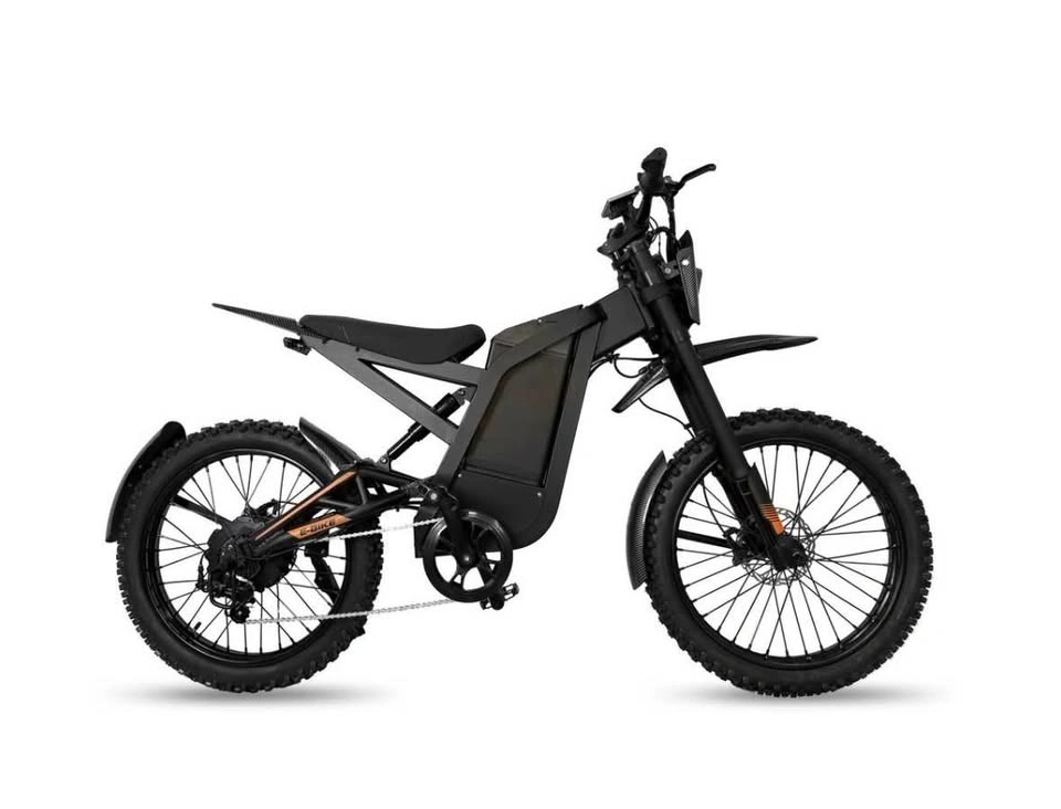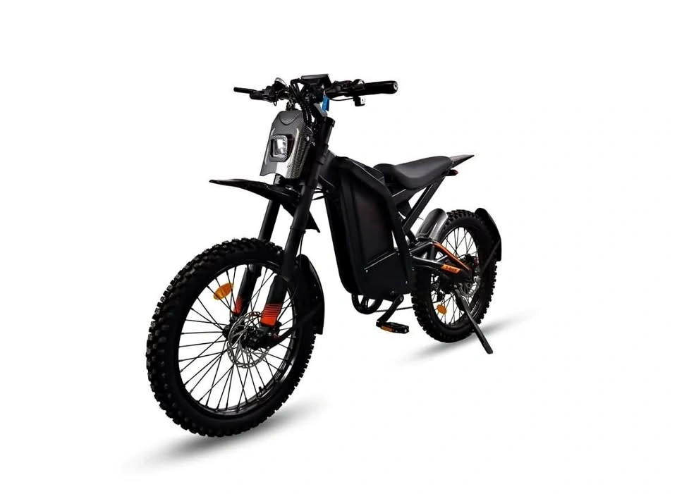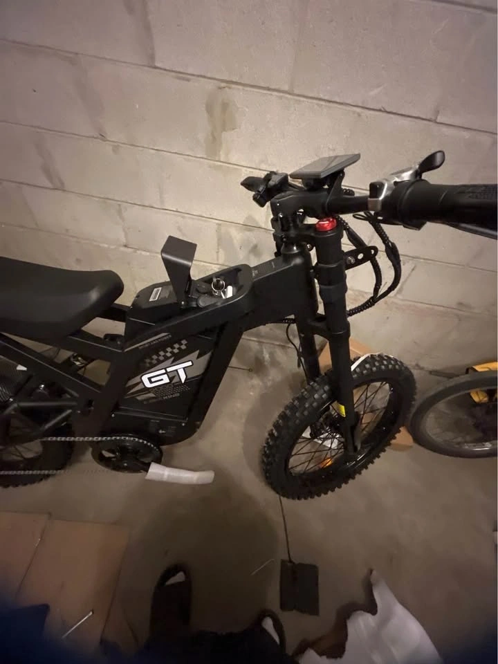 Powerful black electric dirt bike with GT 2000 branding. This e-bike has knobby off-road tires, front suspension, and a sleek matte black frame. It includes a digital display on the handlebars and integrated pedals. The bike is in great shape with very little wear. It goes 60 km/h and has +100 km of range. Handlebar has been modified and replaced. Negotiable to a certain point. Meet up only, and cash-only. Trying to sell ASAP! Considering trades for a Yozma in size 10 or a Valtinsu EM5 Electric Dirt bike. Please only inquire if you have the funds and are ready to purchase.