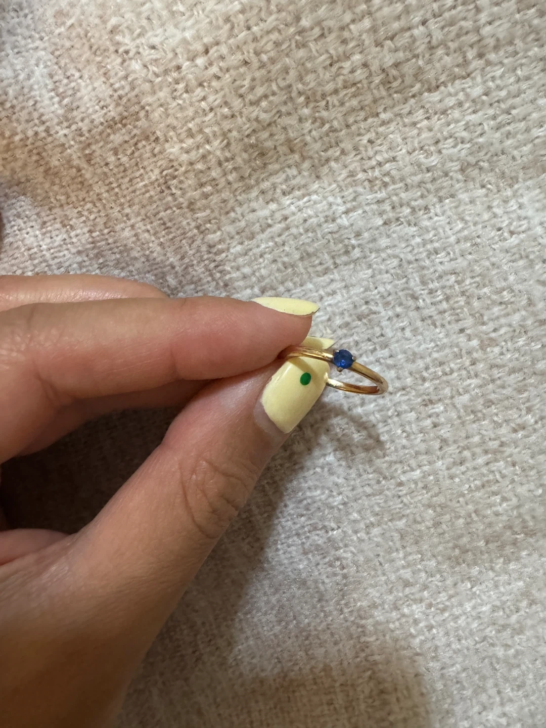 A dainty gold ring featuring a single small blue stone. It's perfect for adding a subtle touch of elegance to any outfit. The minimalist design makes it a versatile piece for everyday wear.