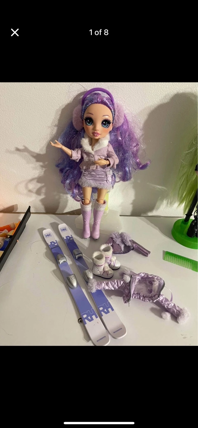 Rainbow High Violet Willow doll. Winter-themed outfit. Includes skis, boots, and accessories. Great condition.