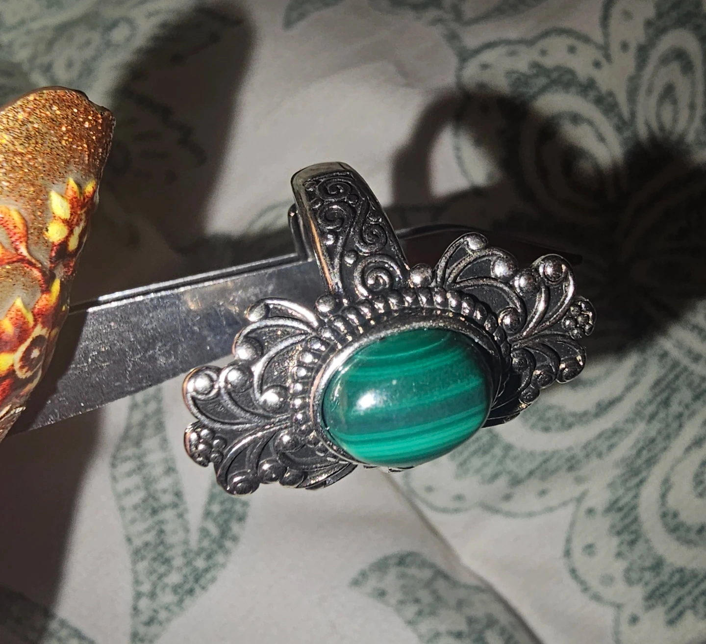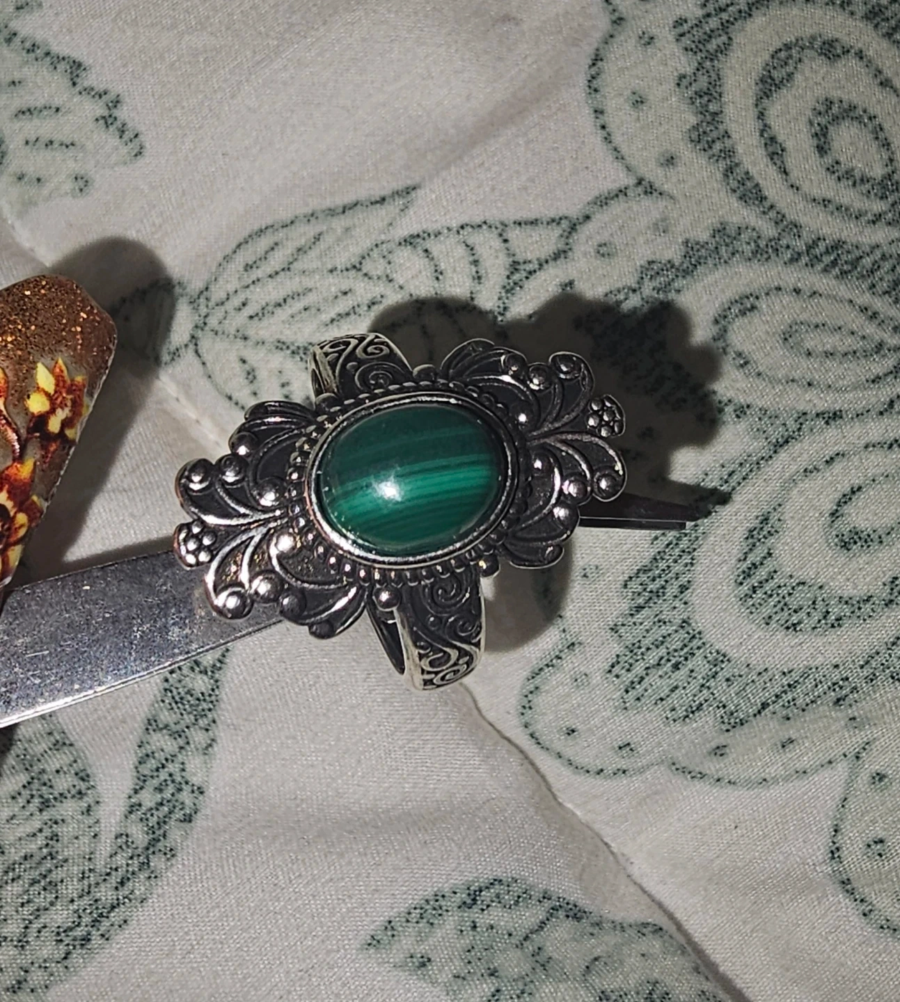 Selling a beautiful copper ring featuring a malachite stone! It has a lovely ornate/ vintage design. Would make a great addition to any jewelry collection. Malachite crystals are believed to absorb negative energy, promote transformation. open the heart, and stimulate imagination.
