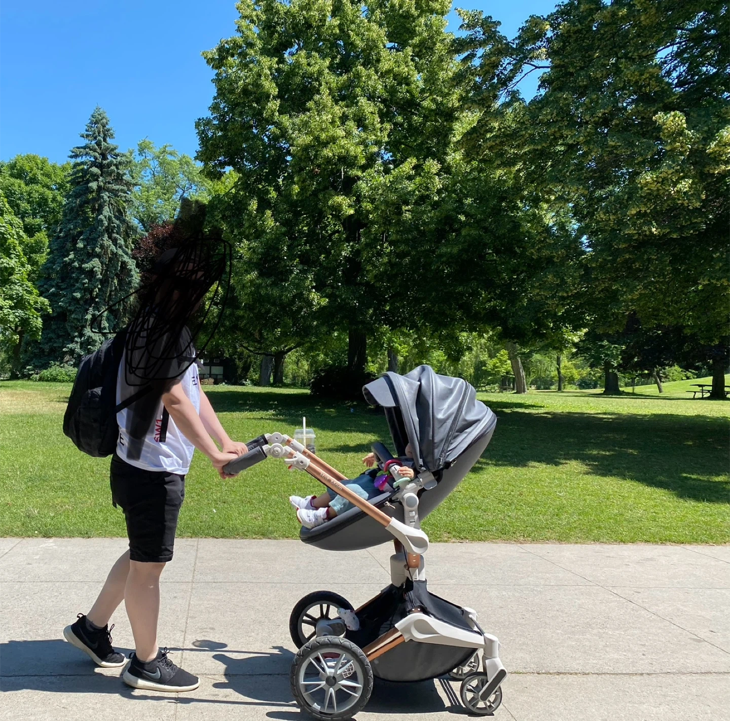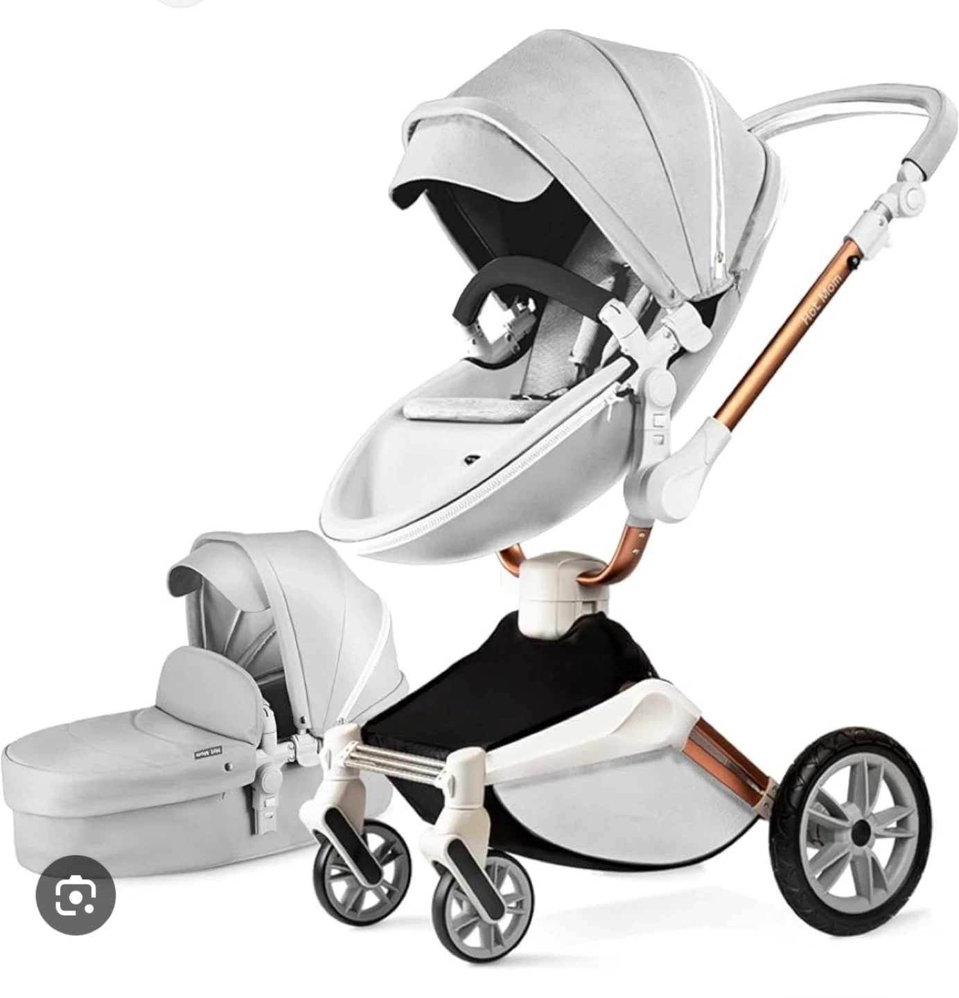 This versatile Hot Mom stroller perfect for toddler from 2. It features a reversible seat and a unique rose gold frame. The large wheels offer a smooth ride for you and your little one on various terrains.