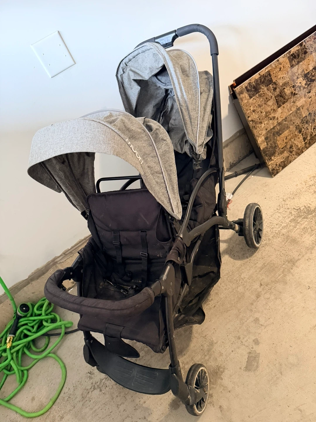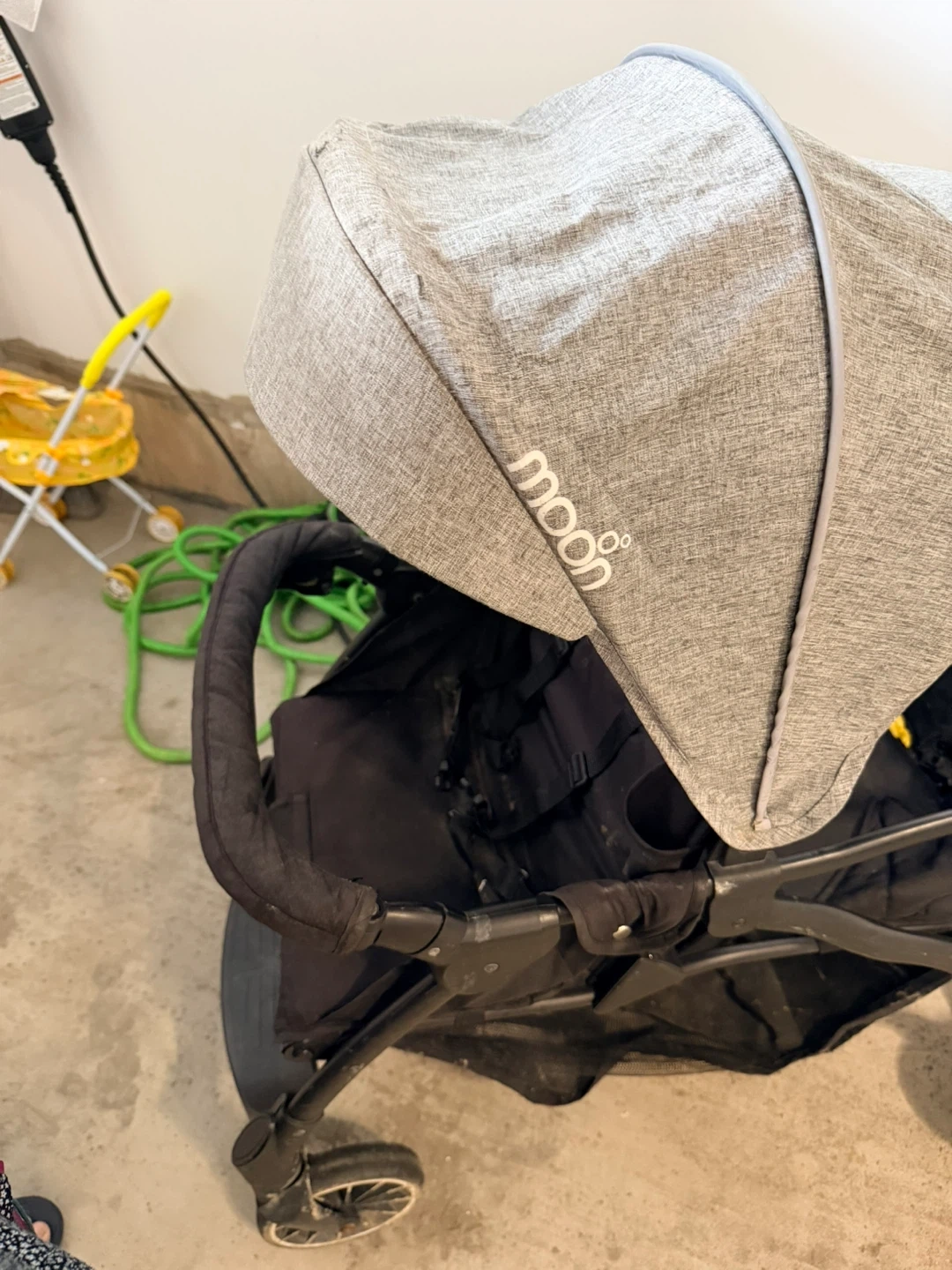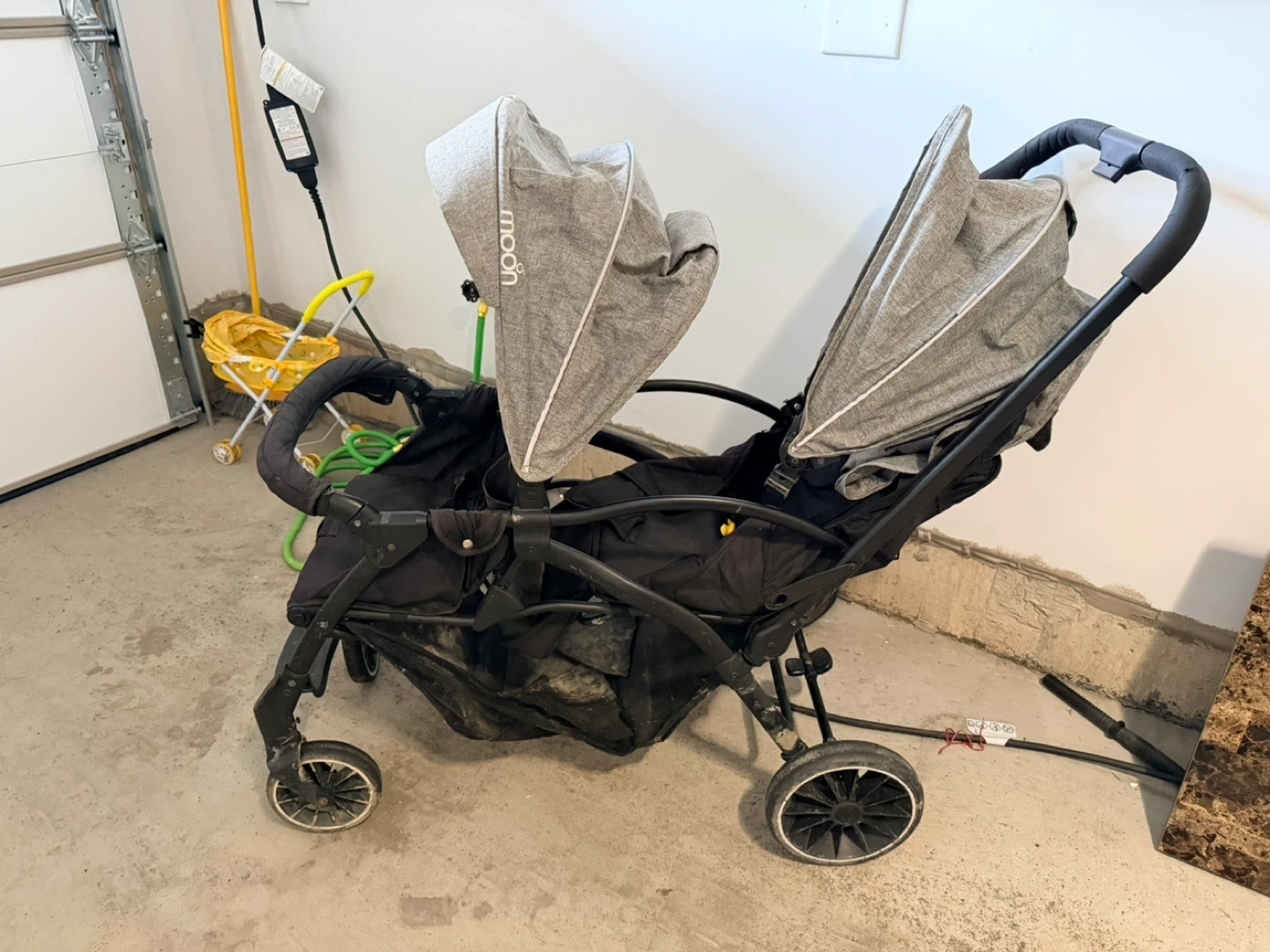 This is a Moon brand double stroller in black and grey. It has two seats with canopies. The stroller is designed for two children to ride at once. Need to change front wheels if needed.