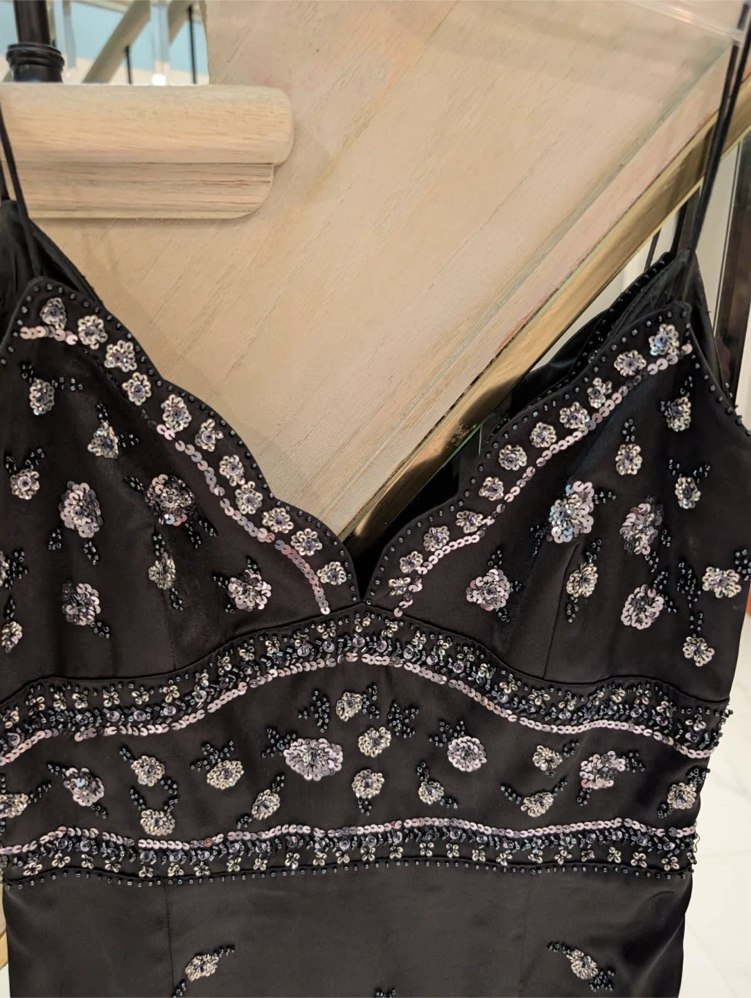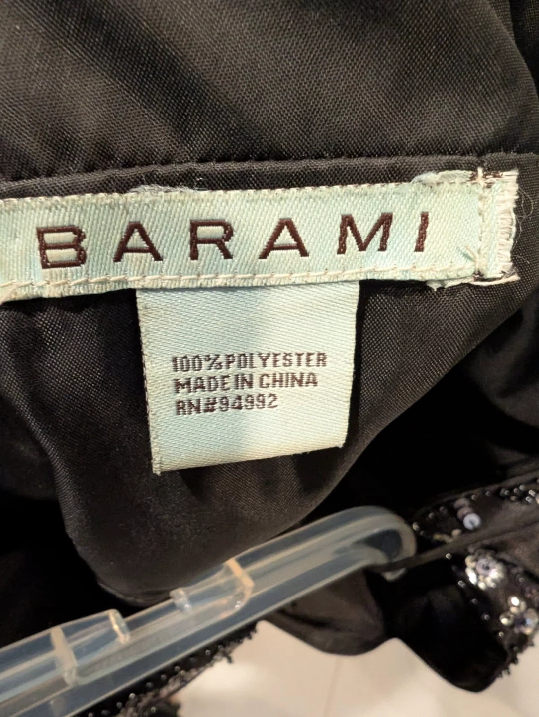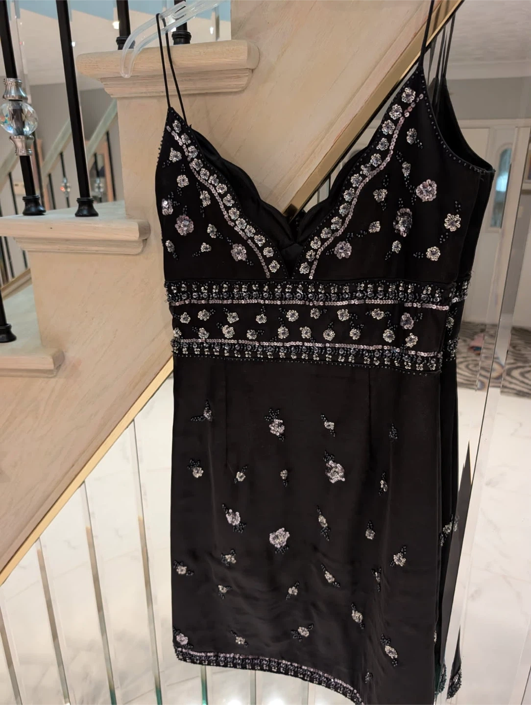Barami black mini dress adorned with intricate beading and sequins. 100% polyester construction. Perfect for a night out or special occasion!