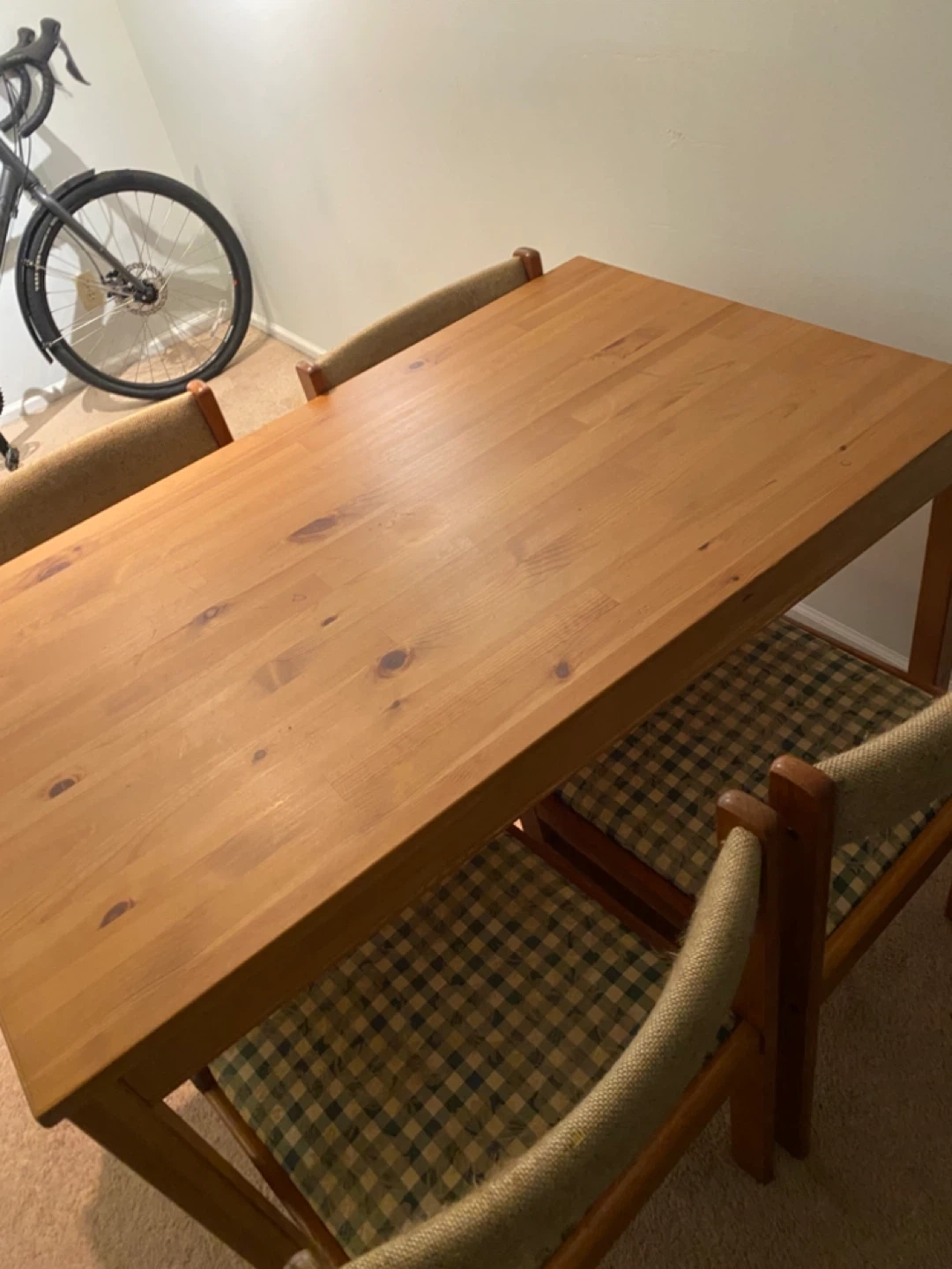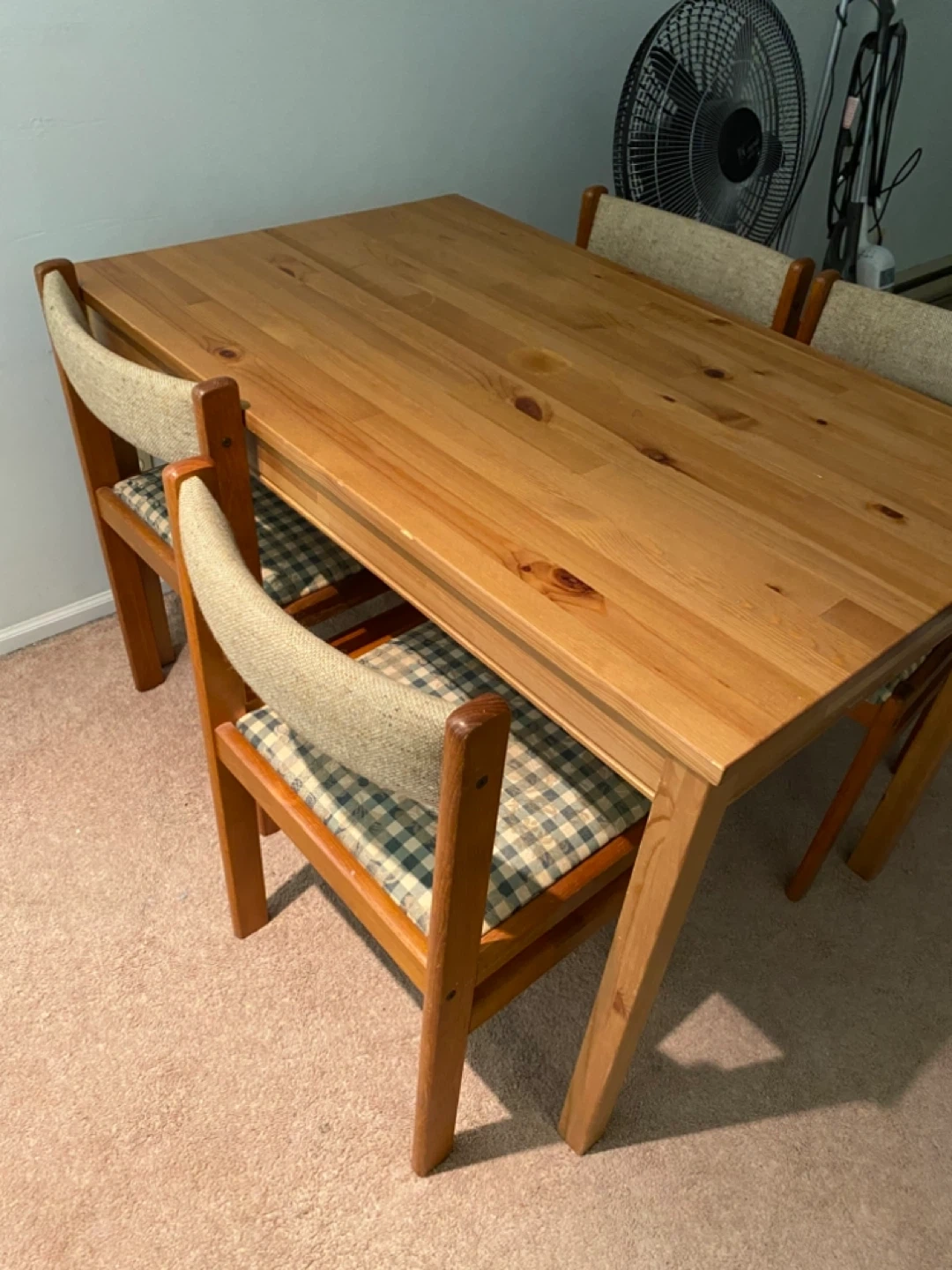 A natural wood dining table with four matching chairs. Chairs have a green and white checkered pattern on the seat and light-coloured fabric backs. Perfect for smaller dining spaces or kitchens!