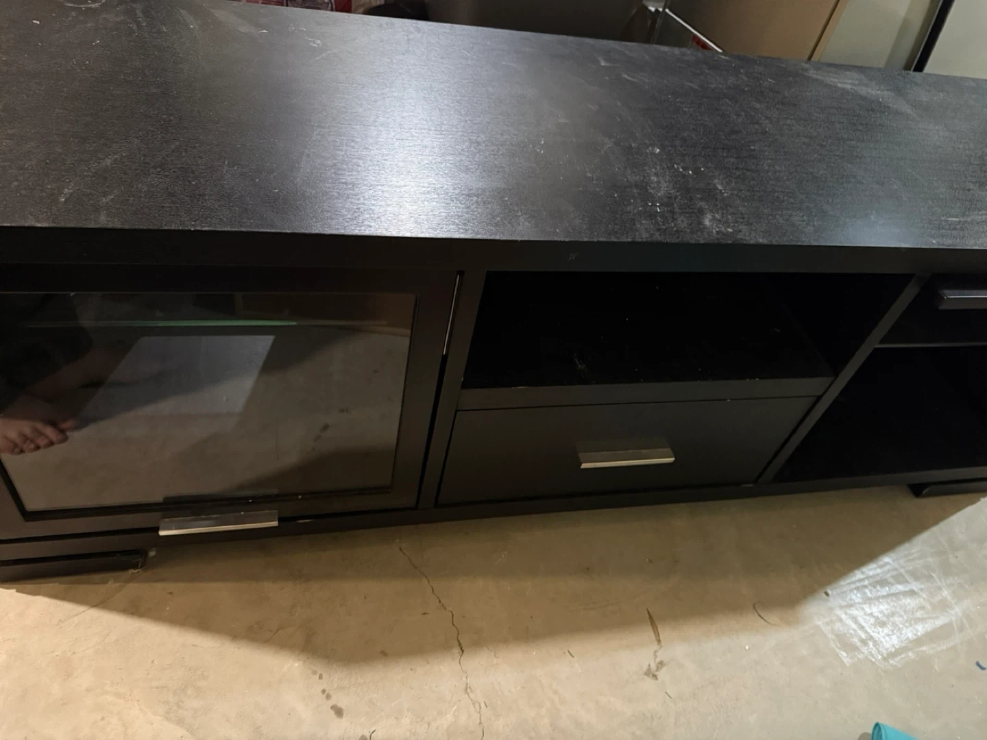 Black TV stand with a glass door on the left, a drawer in the middle, and open shelving on the right. It's designed for media storage. This unit offers a place to house electronics and media accessories.