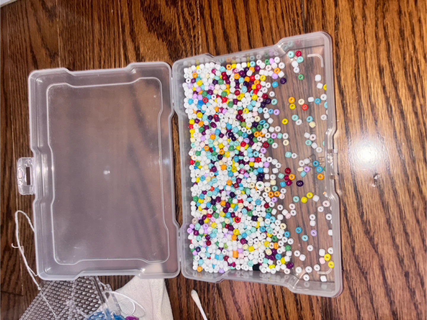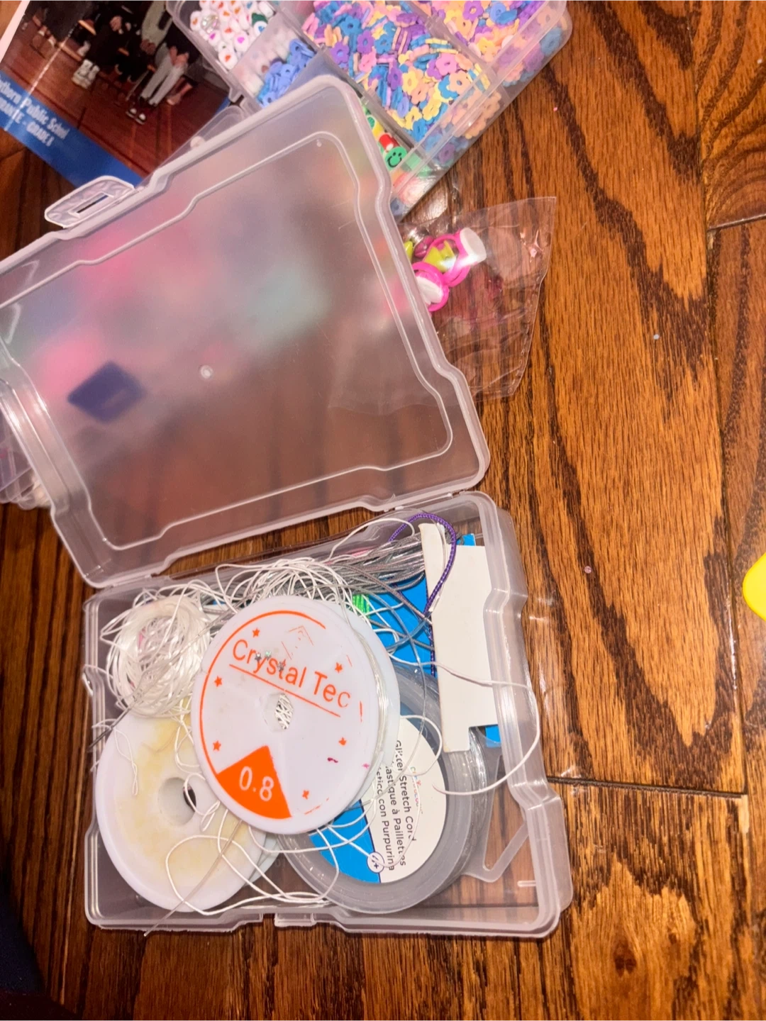 This bead crafting kit includes multiple compartments filled with colourful beads and charms for making jewellery. It also comes with a spool of "Crystal Tec" 0.8mm string. Perfect for creative projects!