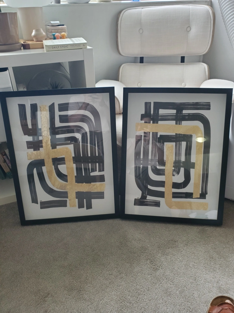 Selling a set of two framed abstract art prints. They feature a modern design with black and gold-toned lines on a white background. The frames are black and in great condition. Perfect for adding a touch of contemporary style to your home!