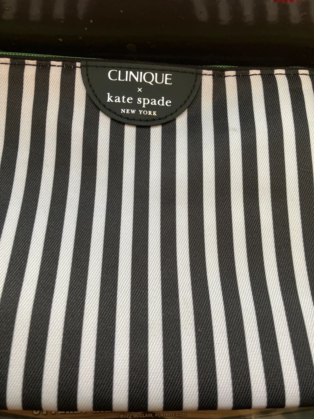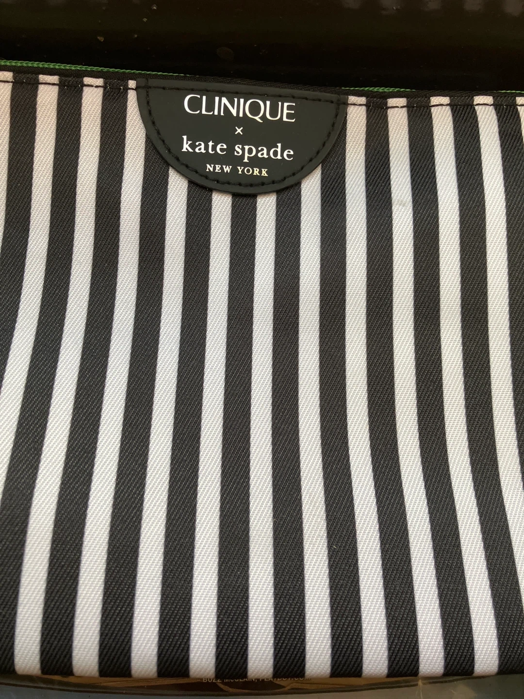 This is a cosmetic bag from the Clinique x Kate Spade New York collaboration. It features a black and white stripe pattern. Zipper closure.