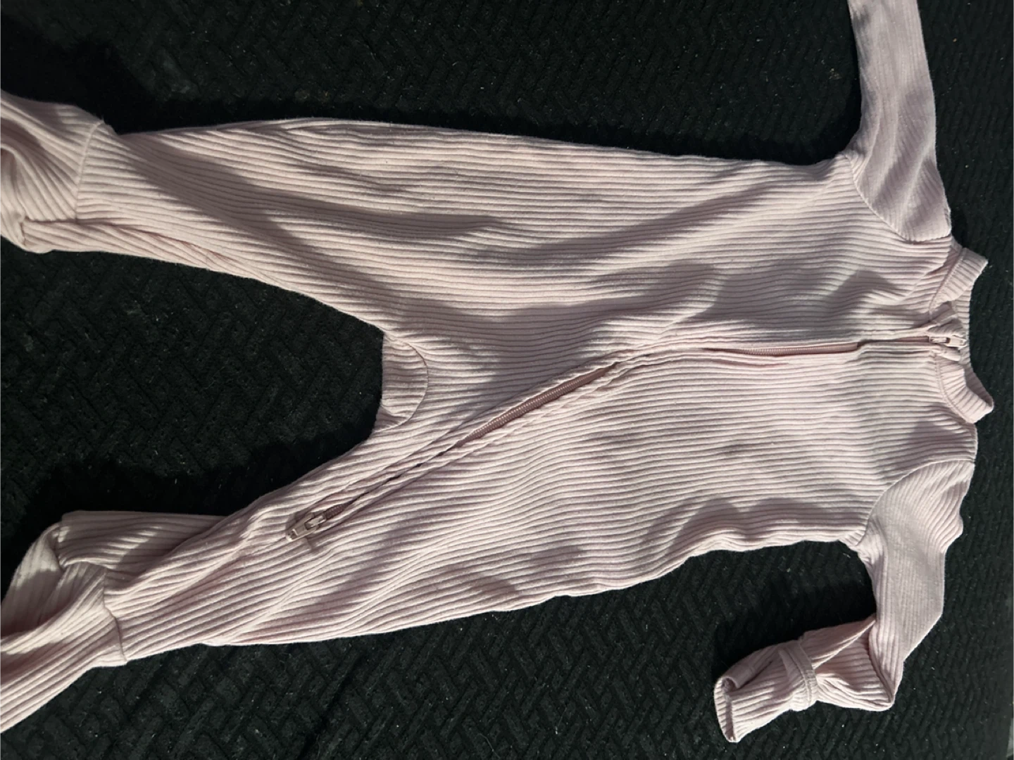 This is a pink, ribbed baby sleepsuit with a zipper closure. It's made of soft, breathable material for comfort. The sleepsuit has footies and long sleeves.