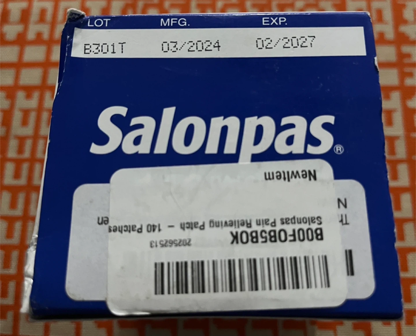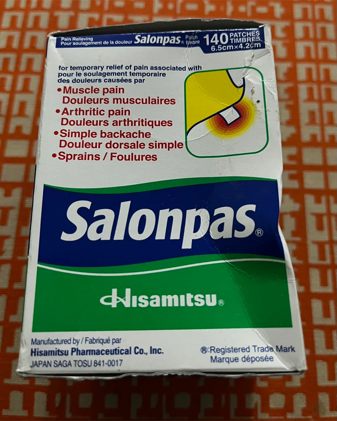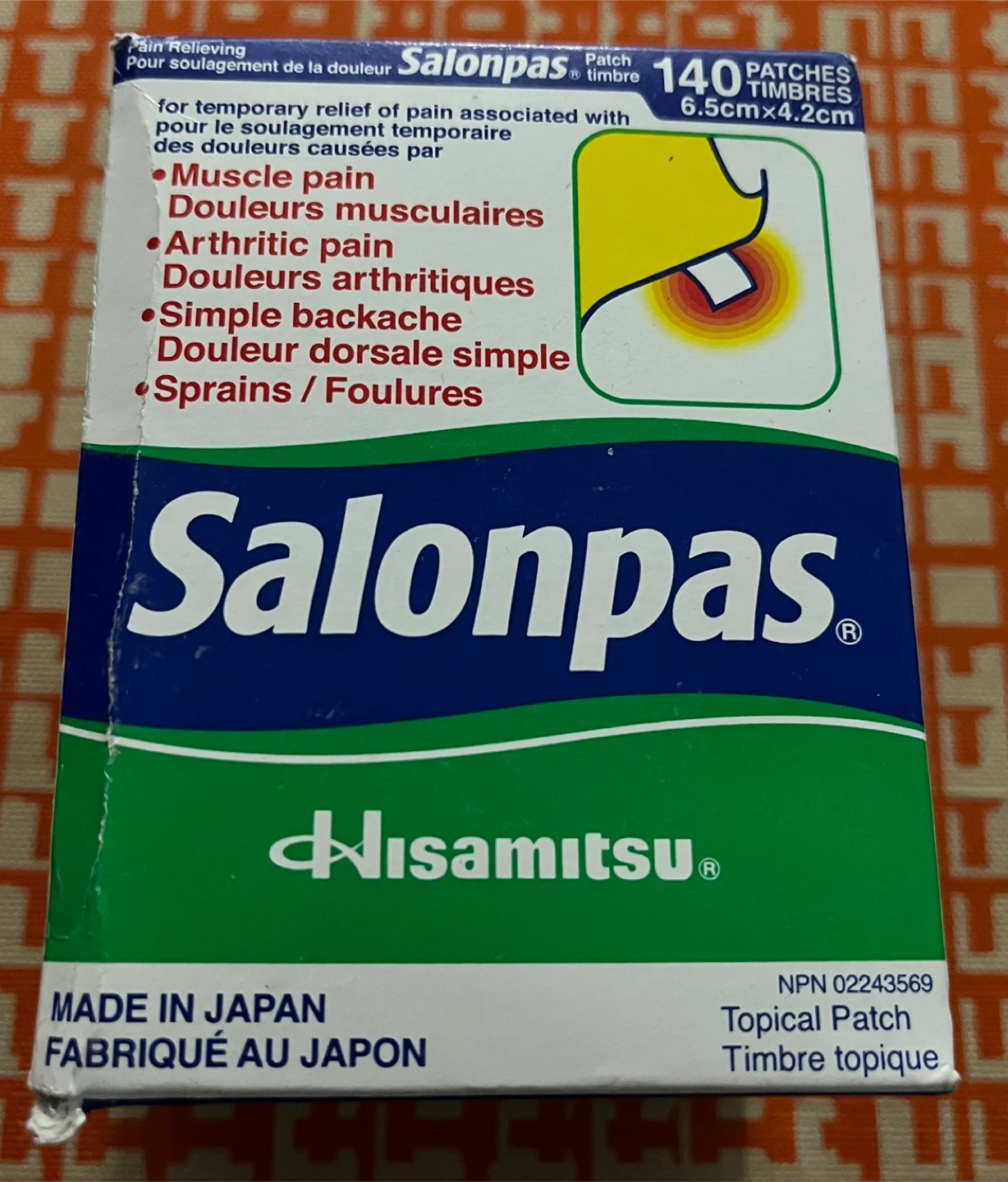 Salonpas pain relieving patches offer temporary relief for muscle and arthritic pain, backaches, and sprains. This box contains 140 patches, each measuring 6.5cm x 4.2cm. Manufactured in Japan.