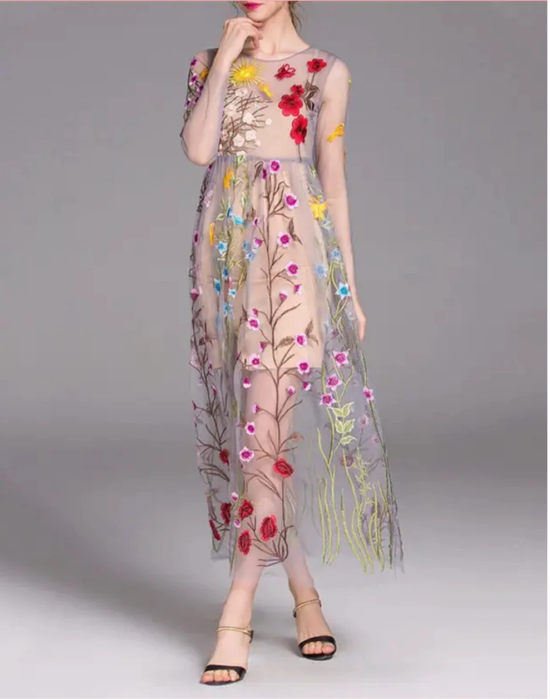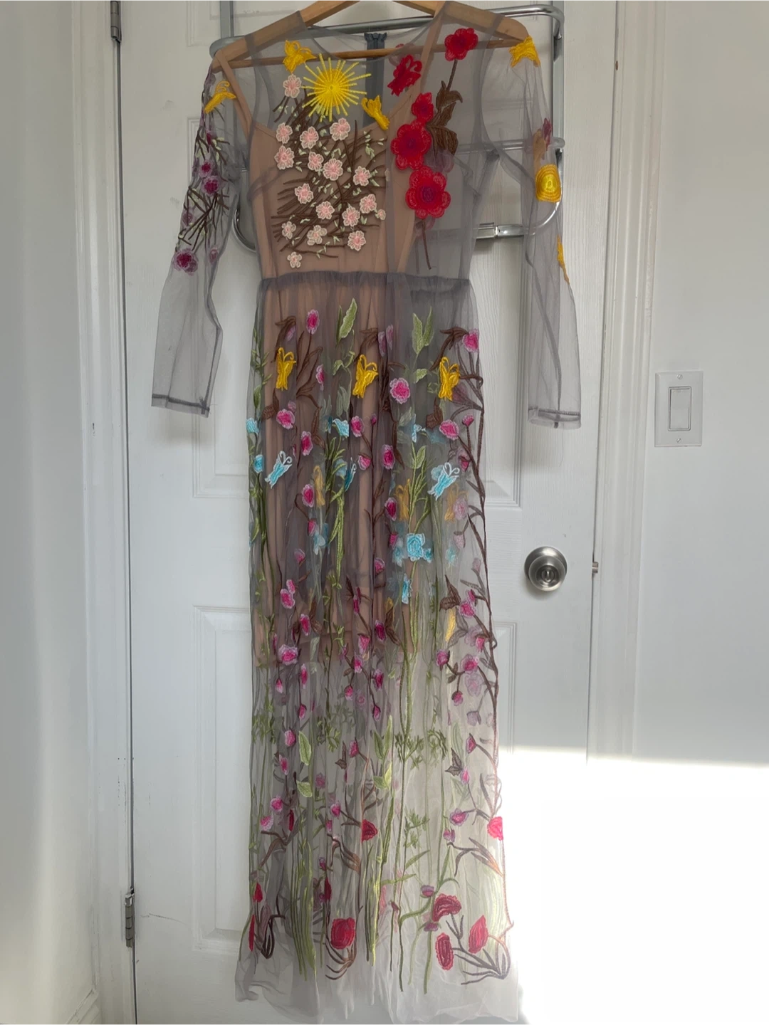 Sheer maxi dress with intricate floral embroidery all over. It features long sleeves and a round neckline. Zipper closure at the back. Perfect for special occasions! Size small.