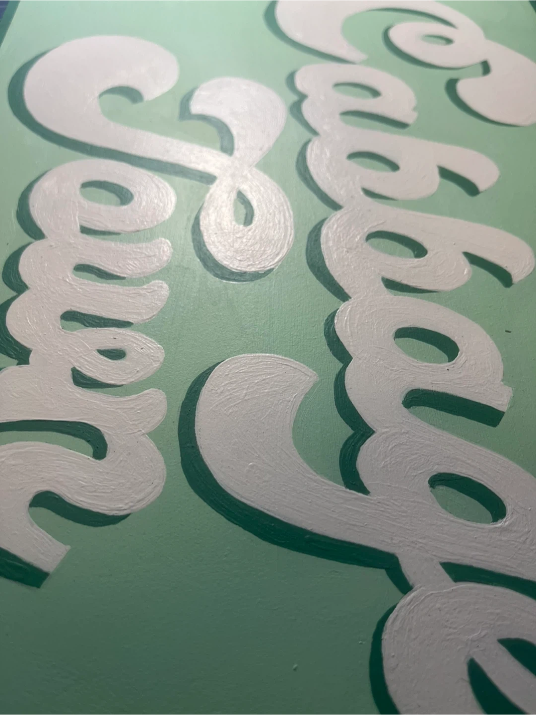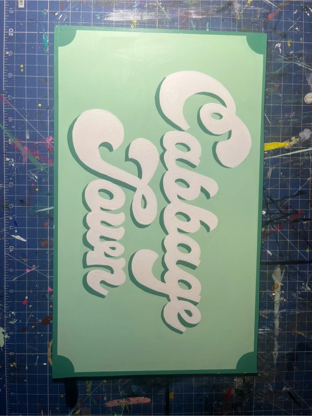 This is a handmade sign that says 'Cabbage Town'. The lettering is white with a shadow effect against a mint green background. It's a fun decorative piece. This sign would look neat on a wall or door! Painted on mdf.