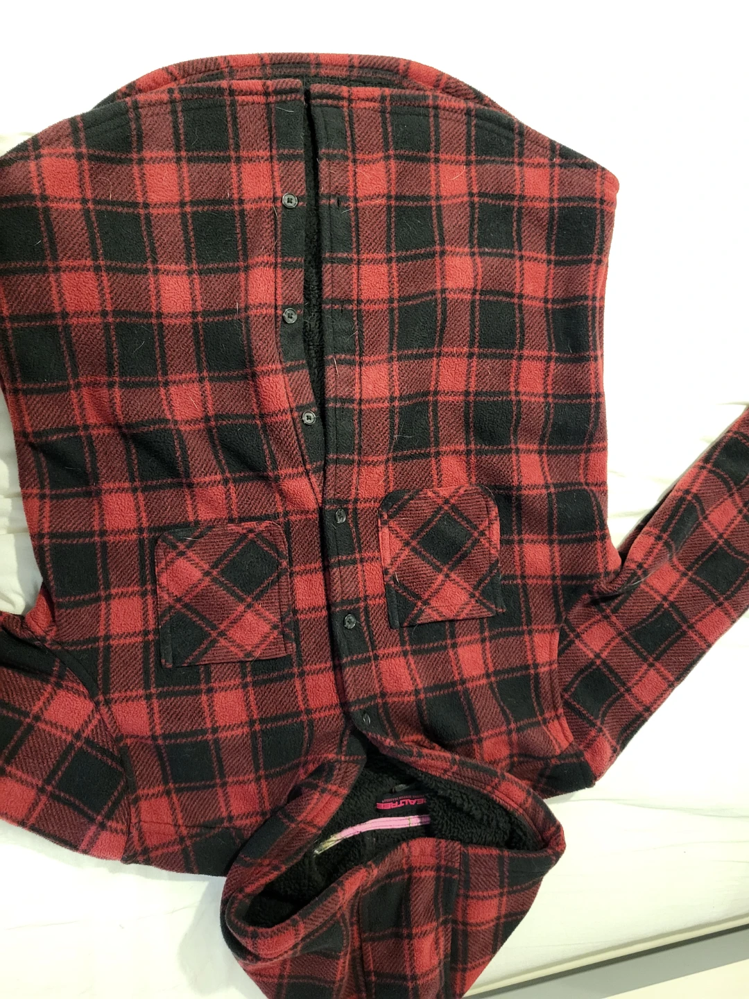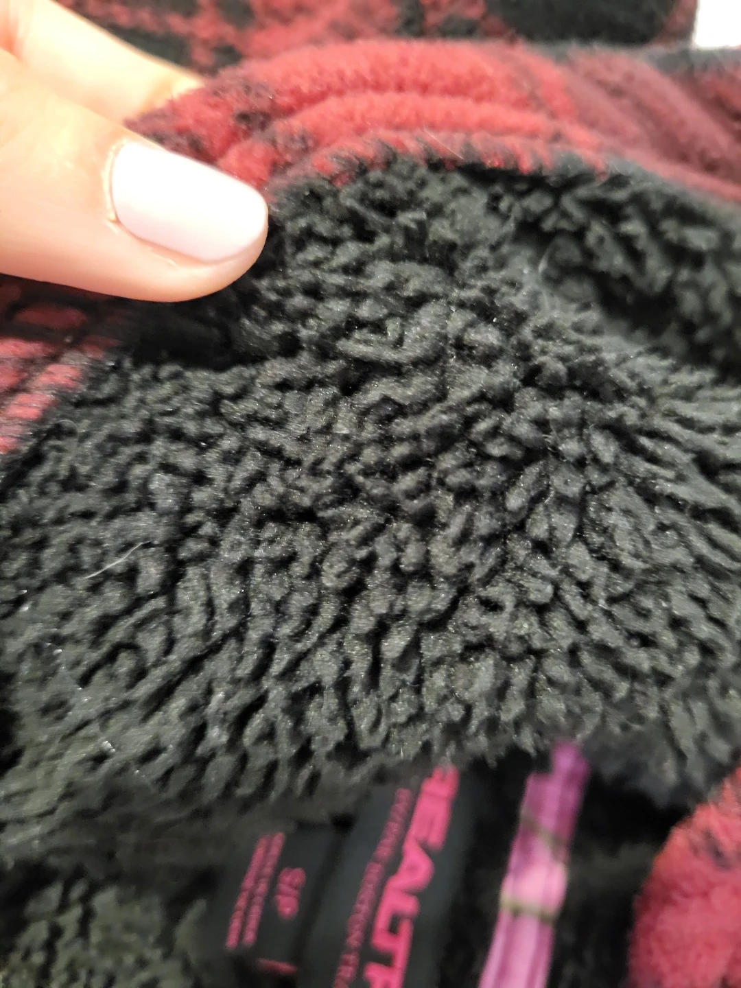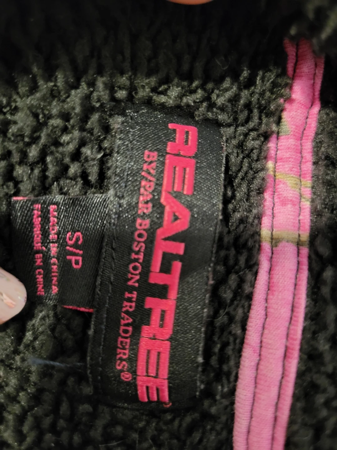 Cozy Realtree flannel hoodie with a warm, sherpa-like lining. Features a classic red and black buffalo plaid pattern and two front pockets. It's a size S/P.
