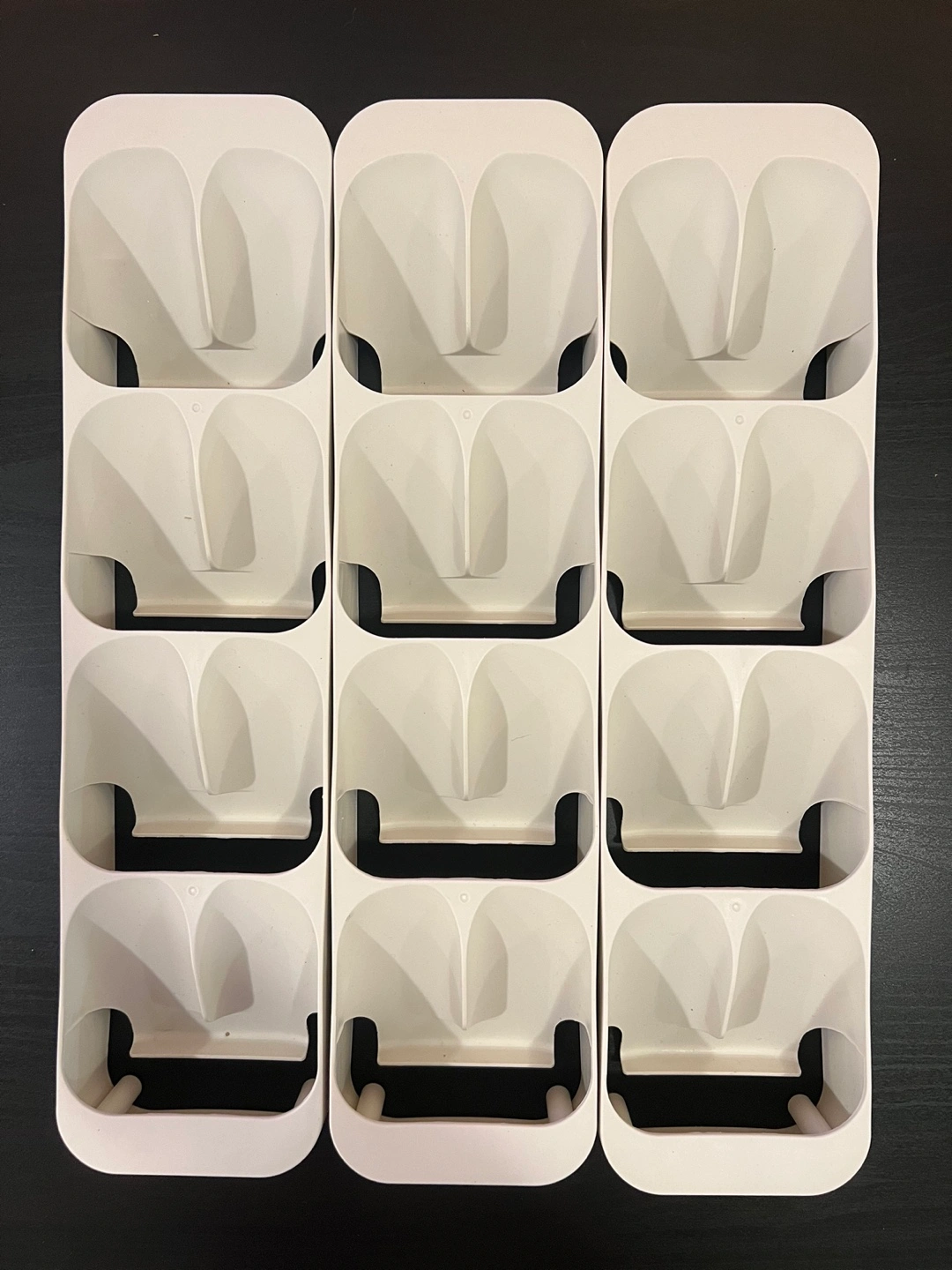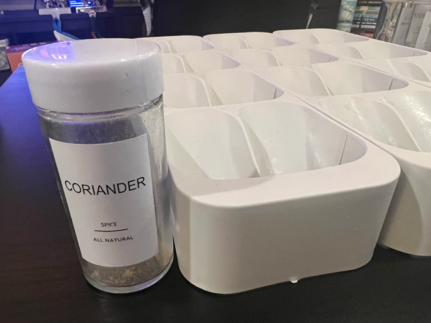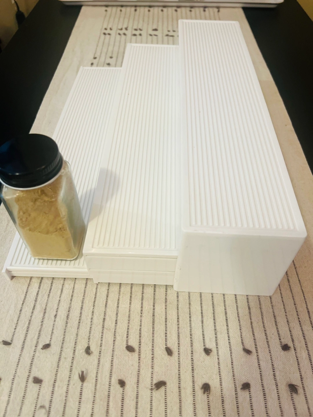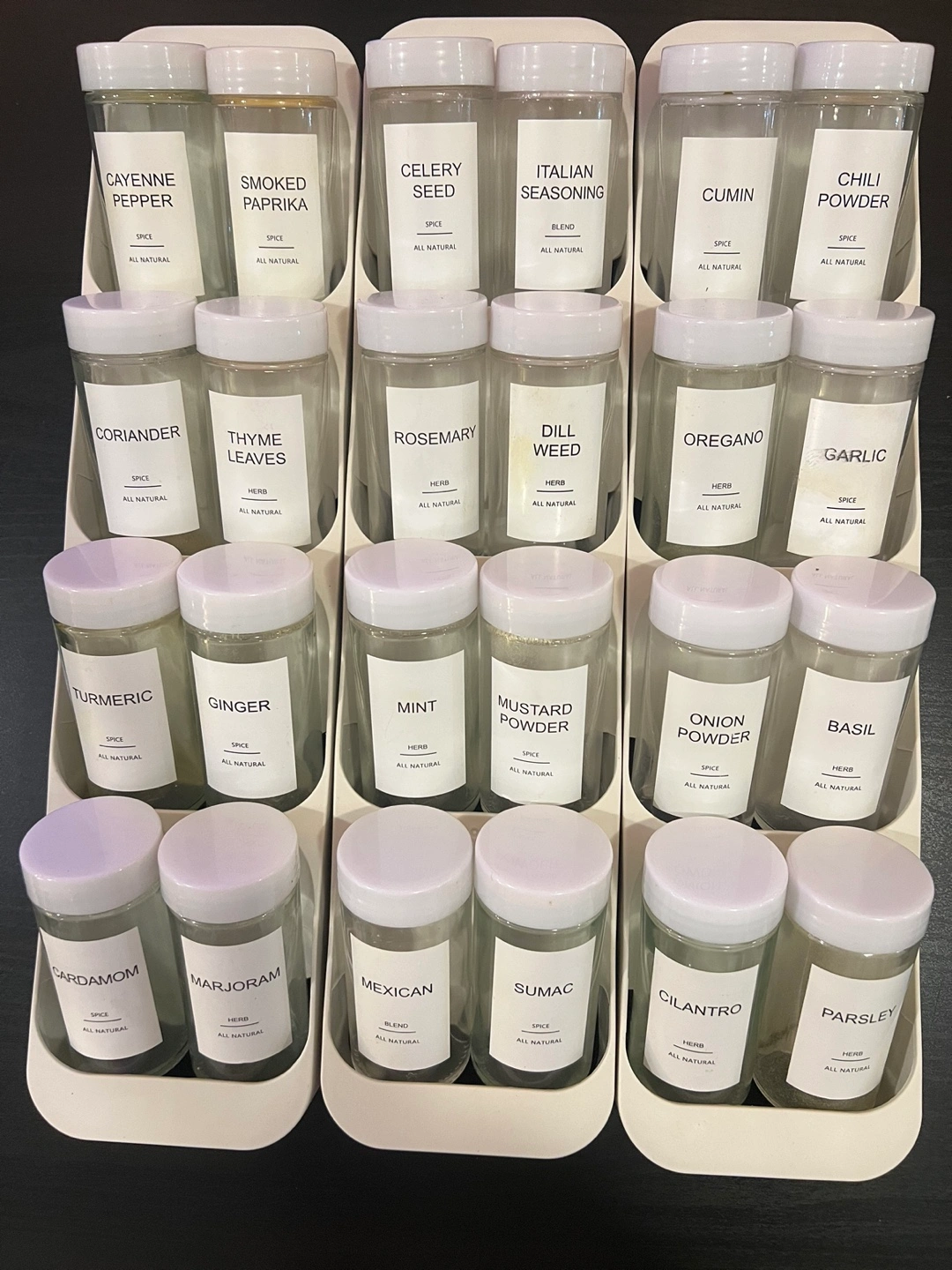 3 White plastic spice rack organizer for drawer (Holds 8 jars each) Great for organizing your spices and keeping them away off your counter. Includes bottles with tags (as shown in pics). They are 2” hight and 4” with the jars on it. So they fit in pretty much any drawer. Also included a shelf for spices in covers. Cash and pick up only at Promenade Mall, Thornhill. Check my other listings for a bundle. Thx