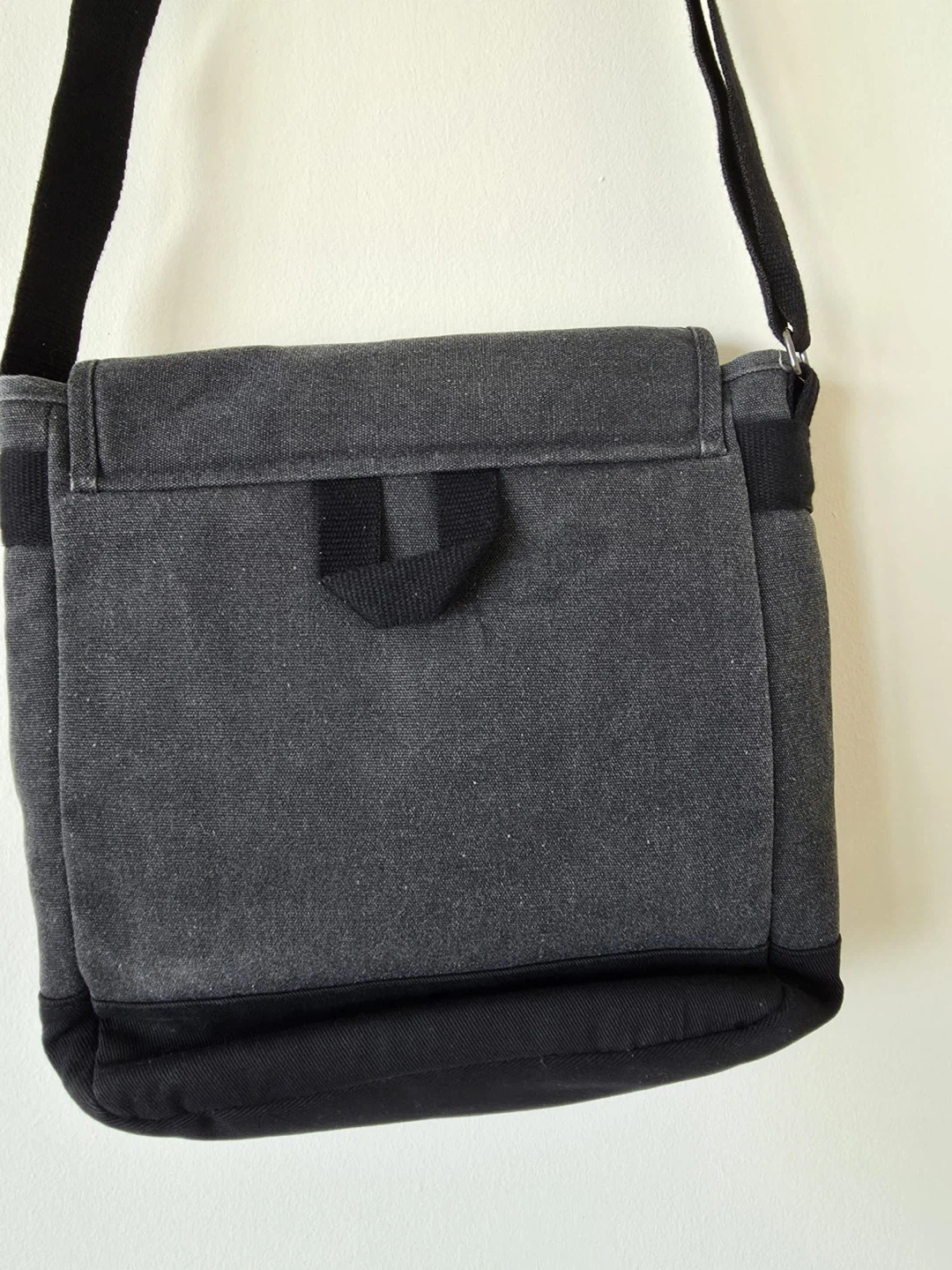 Dark grey canvas messenger bag by Roots 73. It has a zippered front pocket and an adjustable shoulder strap. This bag is great for carrying everyday essentials.