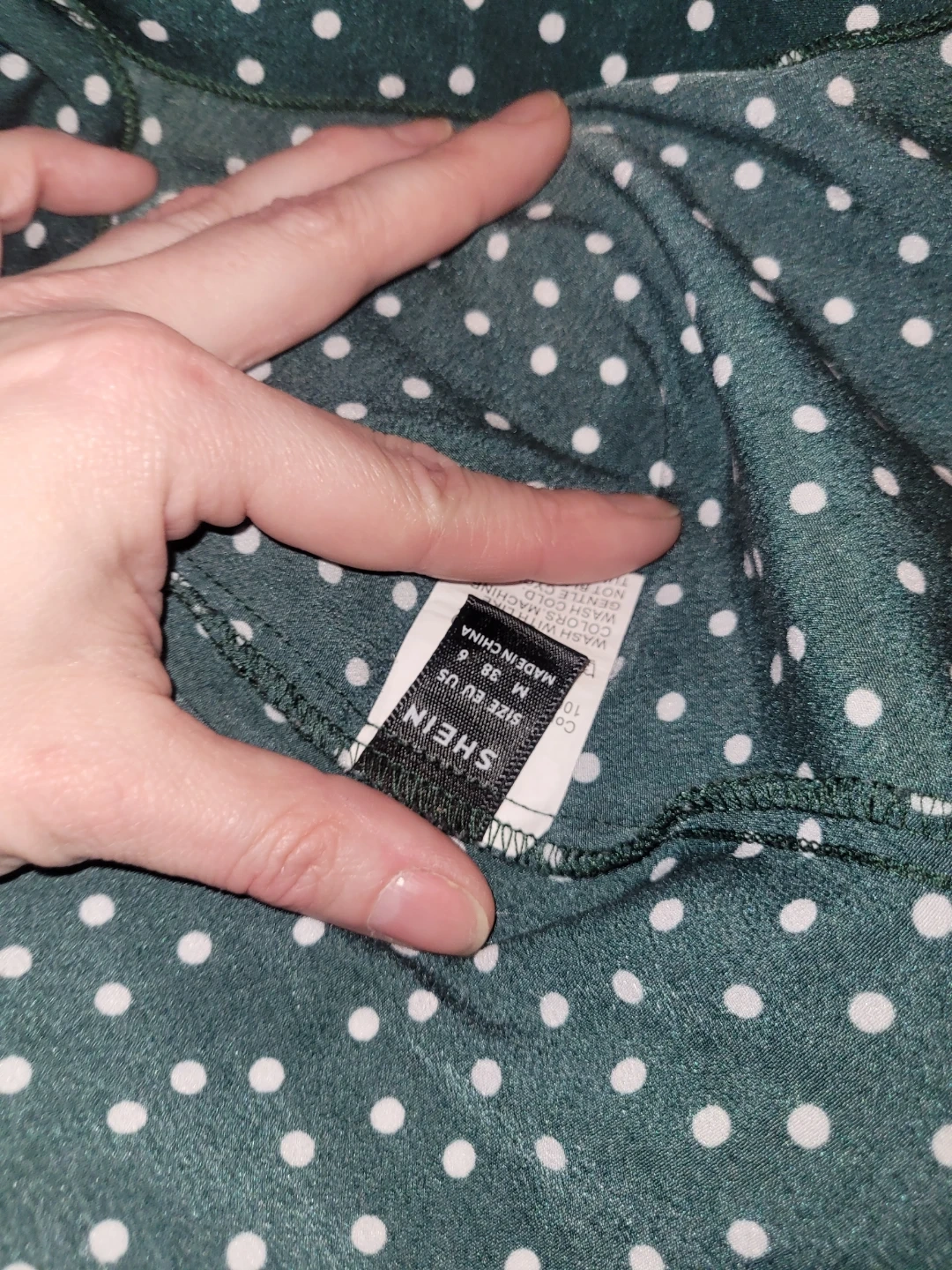This SHEIN dress is a deep green with a white polka dot pattern. It features a V-neck, button-front detail, and ruffle sleeves. The waist is cinched with a drawstring for a flattering fit. Size is medium.