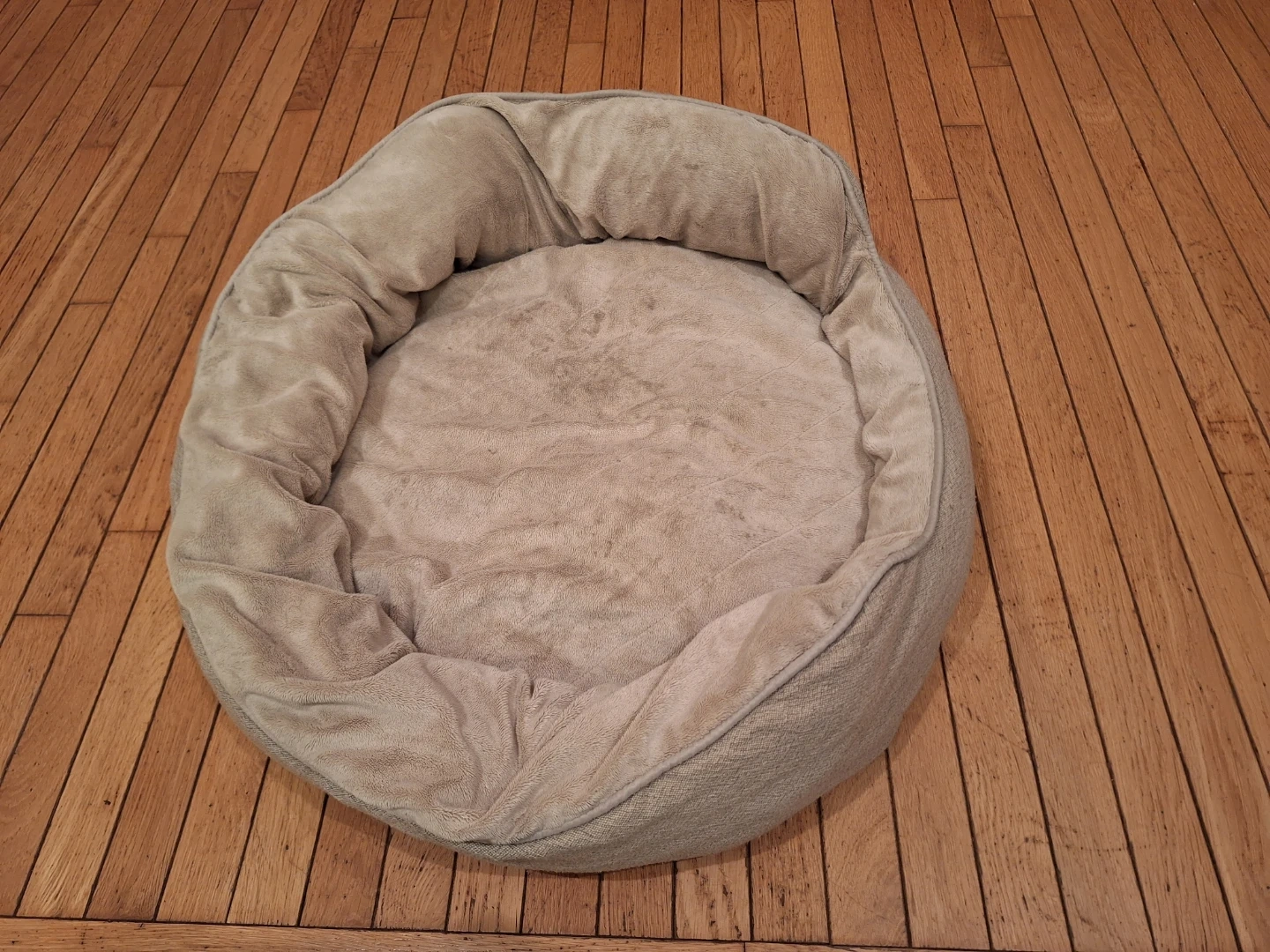 This is a comfy plush pet bed with a raised rim for extra support. Its soft, tan material looks cosy for your furry friend. It's a round shape, perfect for curling up. 66 ~72 inches